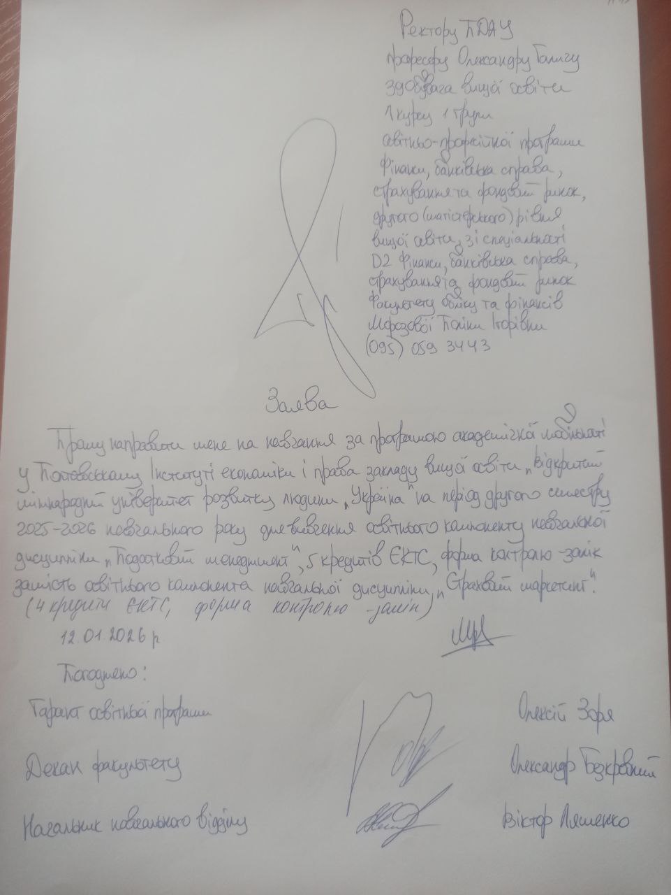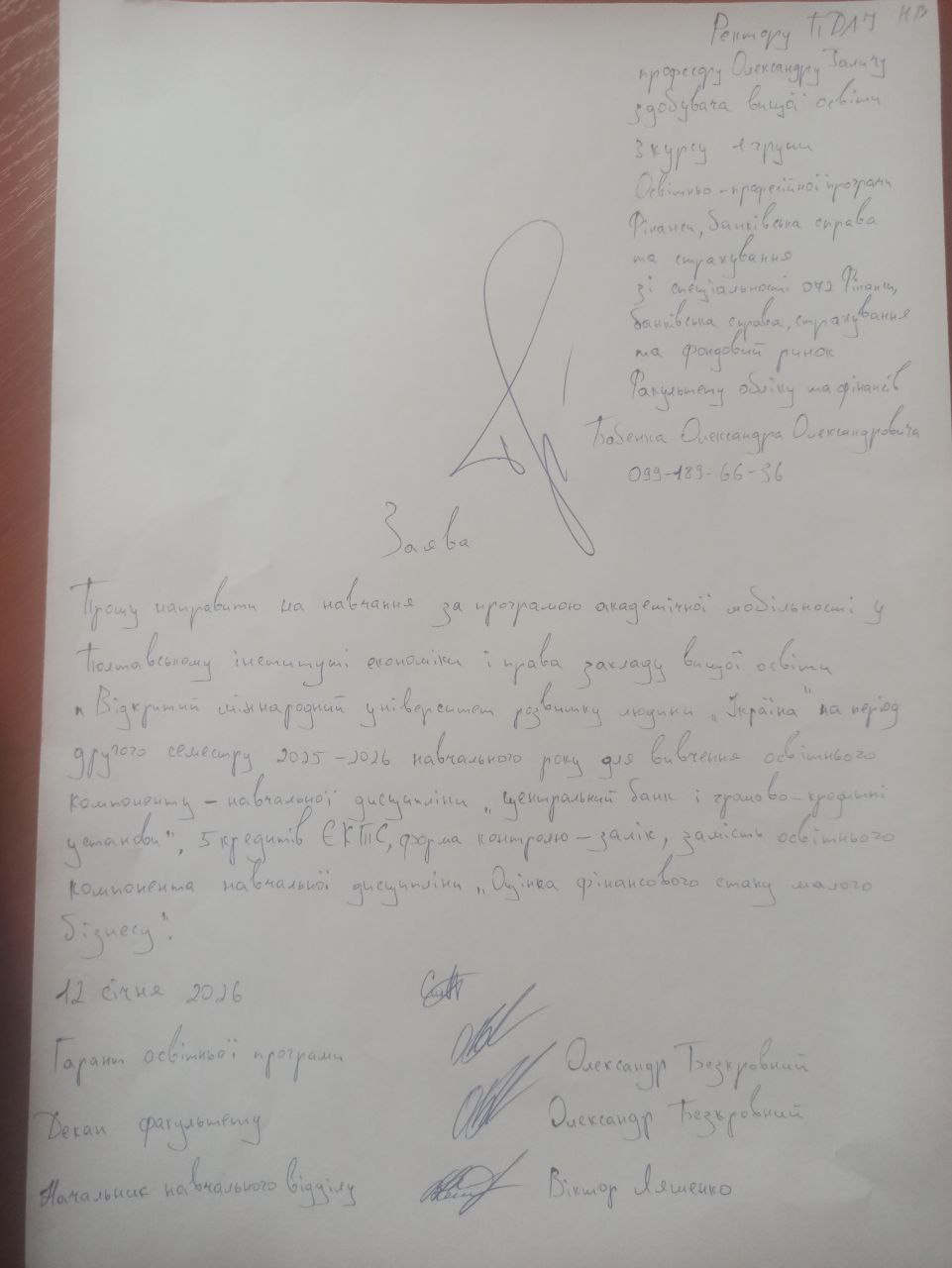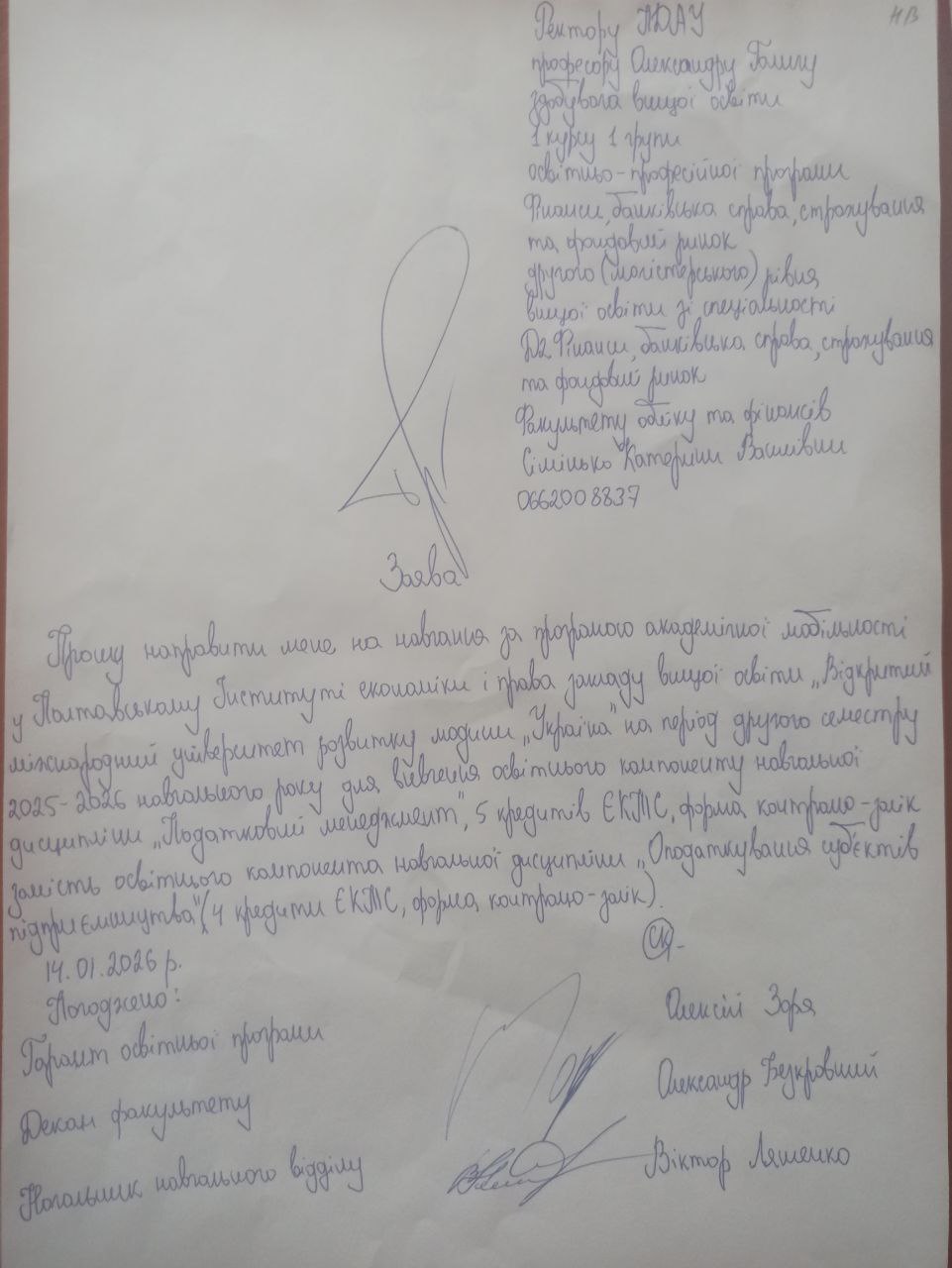 Заява Сімінько Катерини про направлення на навчання за програмою академічної мобільності