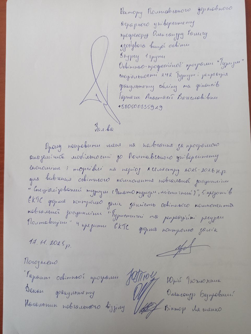 Заява Гарнаги Анастасії про направлення на навчання за програмою академічної мобільності