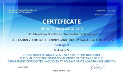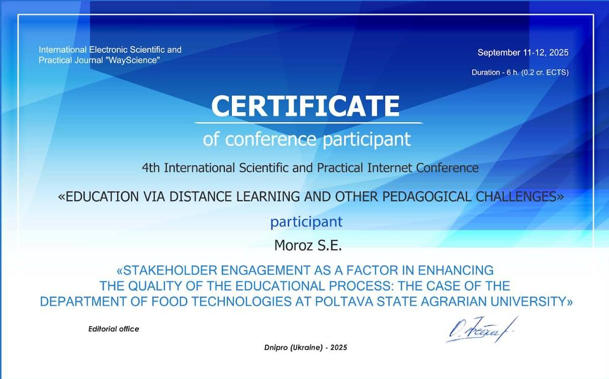 11-12 вересня 2025 року викладачі кафедри харчових технологій представили доповідь: «Stakeholder engagement as a factor in enhancing the quality of the educational process: the case of the Department of Food Technologies at Poltava State Agrarian University» на 4th International Scientific and Practical Internet Conference «Education via Distance Learning and other Pedagogical Challenges».