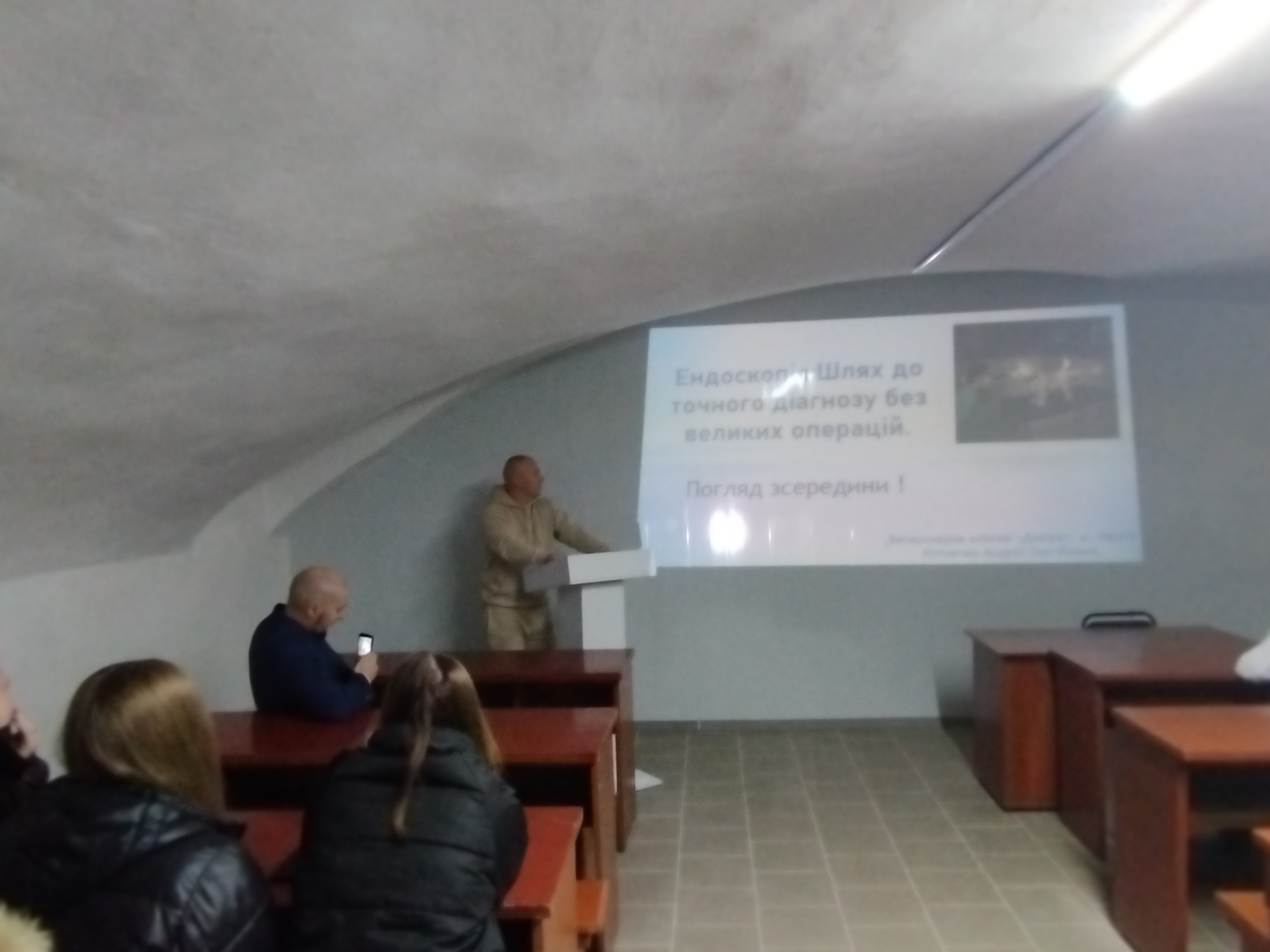 Пан Андрій розповів здобувачам вищої освіти про цілі та методики застосування Ендоскопічних маніпуляцій та поділився власним досвідом завдяки відеороликам відзнчтим підчас проведення оперативних втручань.