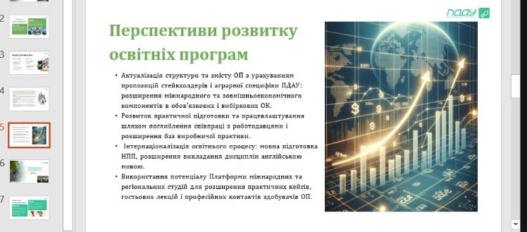 У межах фахового обговорення, яке відбувалось за участі представників бізнесу, органів профільного директорату Офісу Президента України та регіонального розвитку, а також наукової спільноти було підтверджено актуальність освітніх програм спеціальності С1 «Економіка та міжнародні економічні відносини», їх практичну спрямованість і відповідність запитам ринку праці. Стейкхолдерами відзначено позитивну динаміку оновлення змісту програм, якість підготовки здобувачів та ефективність співпраці у форматі практик, гостьових лекцій і використання реальних кейсів. Надані рекомендації стосувалися посилення прикладних модулів із зовнішньоекономічної діяльності, логістики, контрактних і митних процедур, управління ризиками, проєктного менеджменту та продовження позитивної практики академічної мобільності.