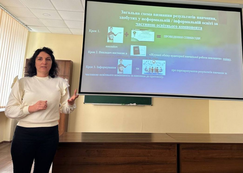 Спікером заходу виступила Максименко Наталія, методист відділу моніторингу та забезпечення якості освіти. Вона поділилася практичними порадами щодо ролі неформальної освіти у формуванні сучасного фахівця, наголосила на важливості постійного саморозвитку та вмінні ефективно використовувати освітні можливості поза межами формальної системи. А також у своїй доповіді вона висвітлила концептуальні засади неформальної освіти як чинника підвищення якості підготовки фахівців у контексті сучасних вимог ринку праці, акцентувавши увагу на інтеграції формальних і неформальних освітніх практик у системі безперервного професійного розвитку.