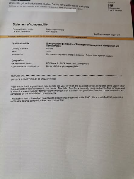 28.01.2023 р. Підтвердження кваліфікації PhD з менеджменту у Великобританії випускниці ПДАУ, що здобувала ступінь вищої освіти "Доктор філософії" за ОНП Менеджмент. Детальніше... |
