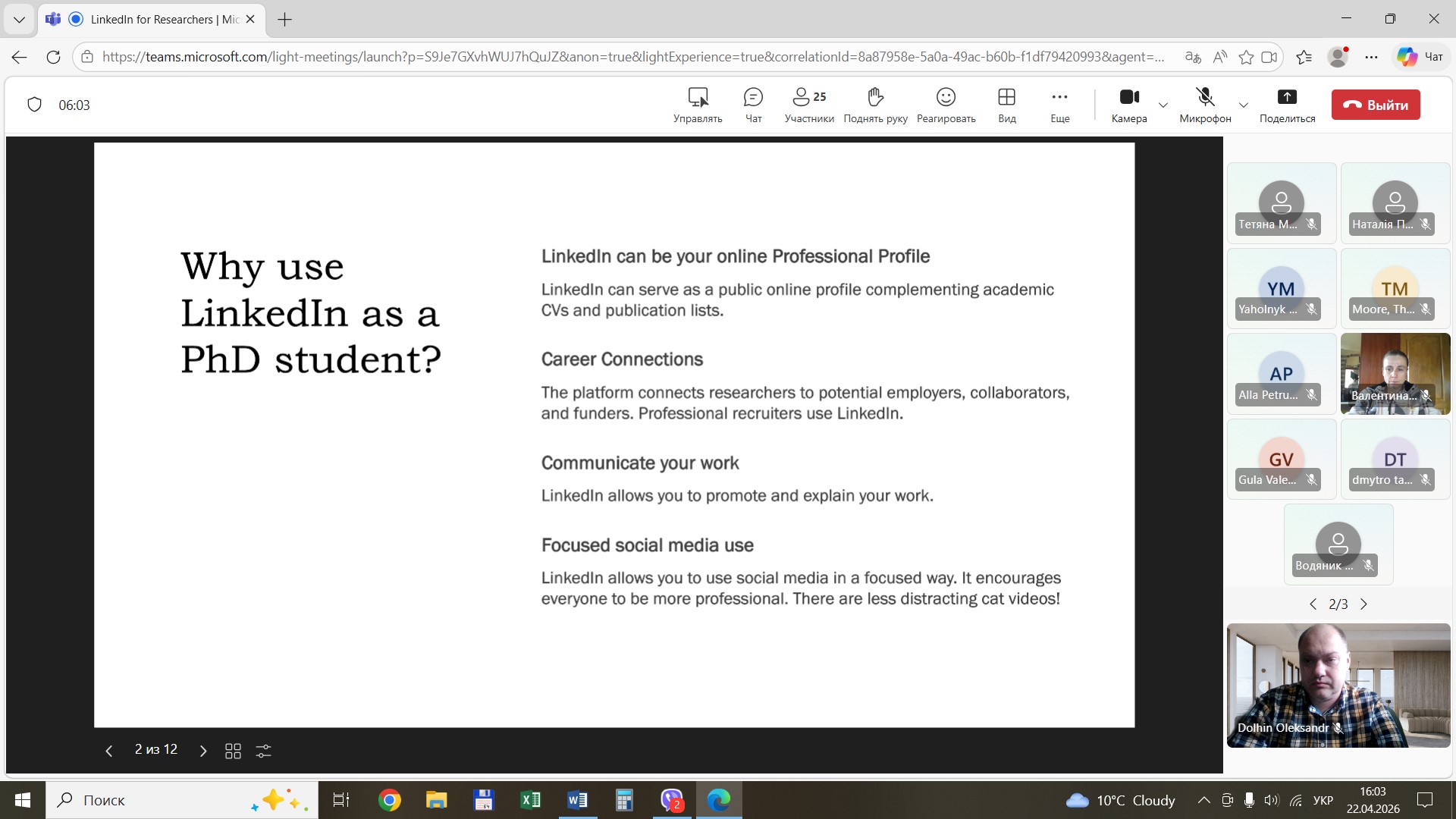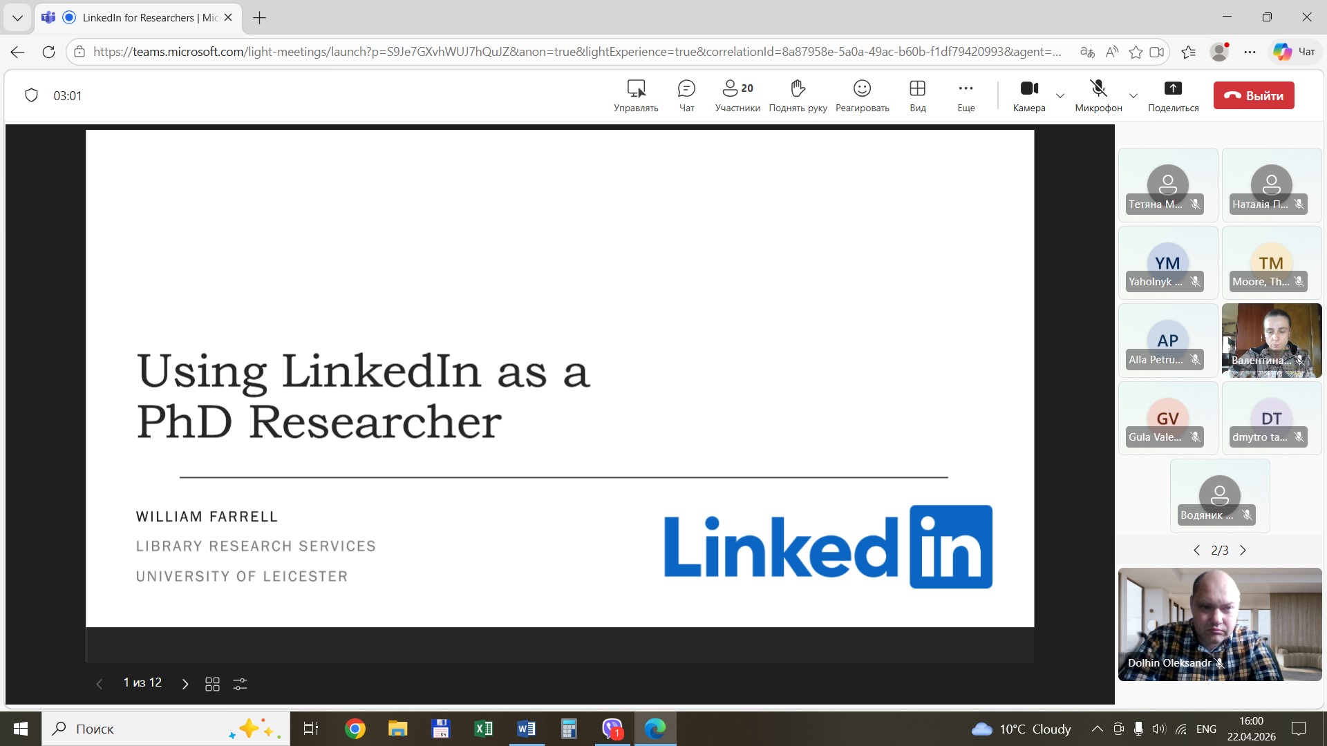 22 квітня 2026 року в режимі онлай аспіранти та викладачі кафедри паразитології та ветеринарно-санітарної експертизи Полтавського державного аграрного університету взяли участь у вебінарі «LinkedIn для науковців: побудова міжнародного цифрового бренду».