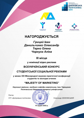 Вітаємо переможців із заслуженою відзнакою та дякуємо їм за відповідальність, мотивацію й гідне представлення університету на всеукраїнському рівні. Висловлюємо щиру подяку кафедрі маркетингу та організаційному комітету НТУ «Дніпровська політехніка» за високий рівень організації заходу та створення професійної платформи для розвитку студентської креативності й соціально відповідального маркетингу.