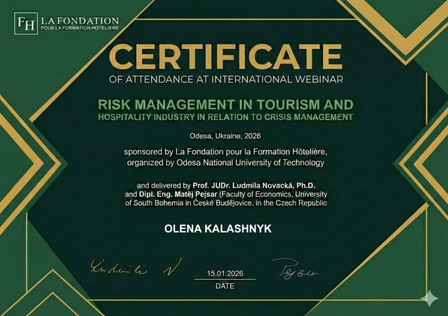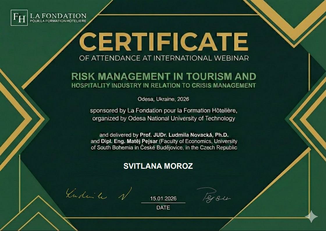 15 січня 2026 року викладачі нашої кафедри долучилися до міжнародного вебінару «Risk Management in Tourism and Hospitality Industry in Relation to Crisis Management», який відбувся в онлайн-форматі.