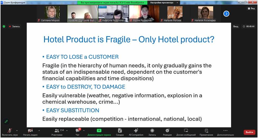 Вебінар було організовано за підтримки La Fondation pour la Formation Hôtelière (Швейцарія) у співпраці з Одеським національним технологічним університетом (кафедра готельно-ресторанного бізнесу). Спікерами виступили Prof. JUDr. Ludmila Novacká, Ph.D. (Університет Південної Богемії, Чехія) та Dipl. Eng. Matěj Pejsar –дослідник і викладач, експерт з розвитку туристичних дестинацій і стратегічного планування (Чехія).