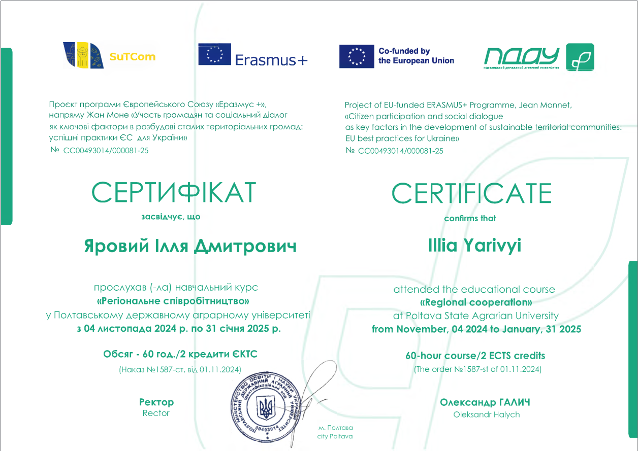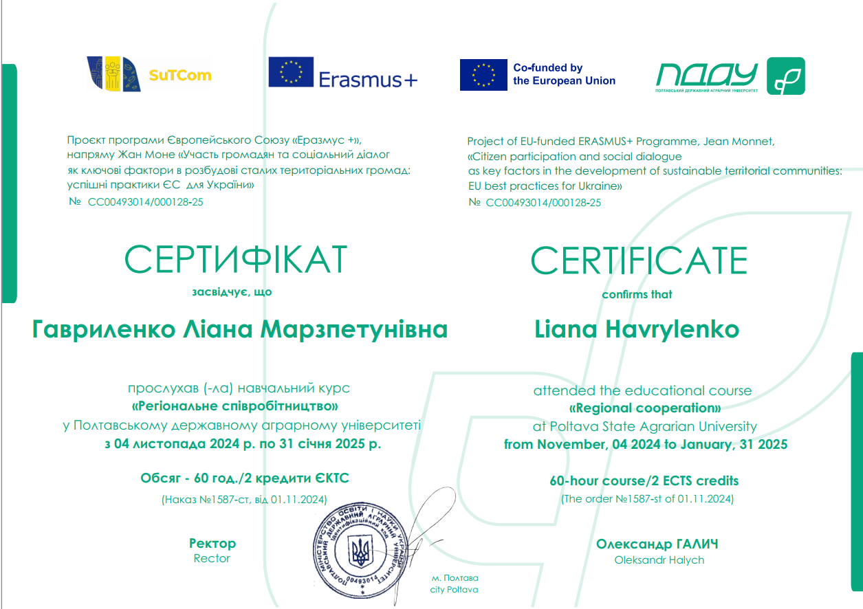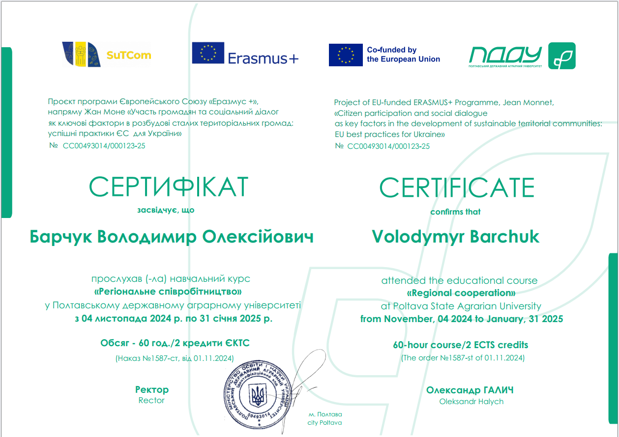 • Здобувачі вищої освіти СВО Доктор філософії ОНП Публічне управління та адміністрування прослухали навчальний курс "Регіональне співробітництво" у ПДАУ з 04 листопада 2024 року по 31 січня 2025 року. Обсяг - 60 год / 2 кредити ЕКТС (Проєкт програми Європейського Союзу «Еразмус +», напряму Жан Моне «Участь громадян та соціальний діалог як ключові фактори в розбудові сталих територіальних громад: успішні практики ЄС для України»).