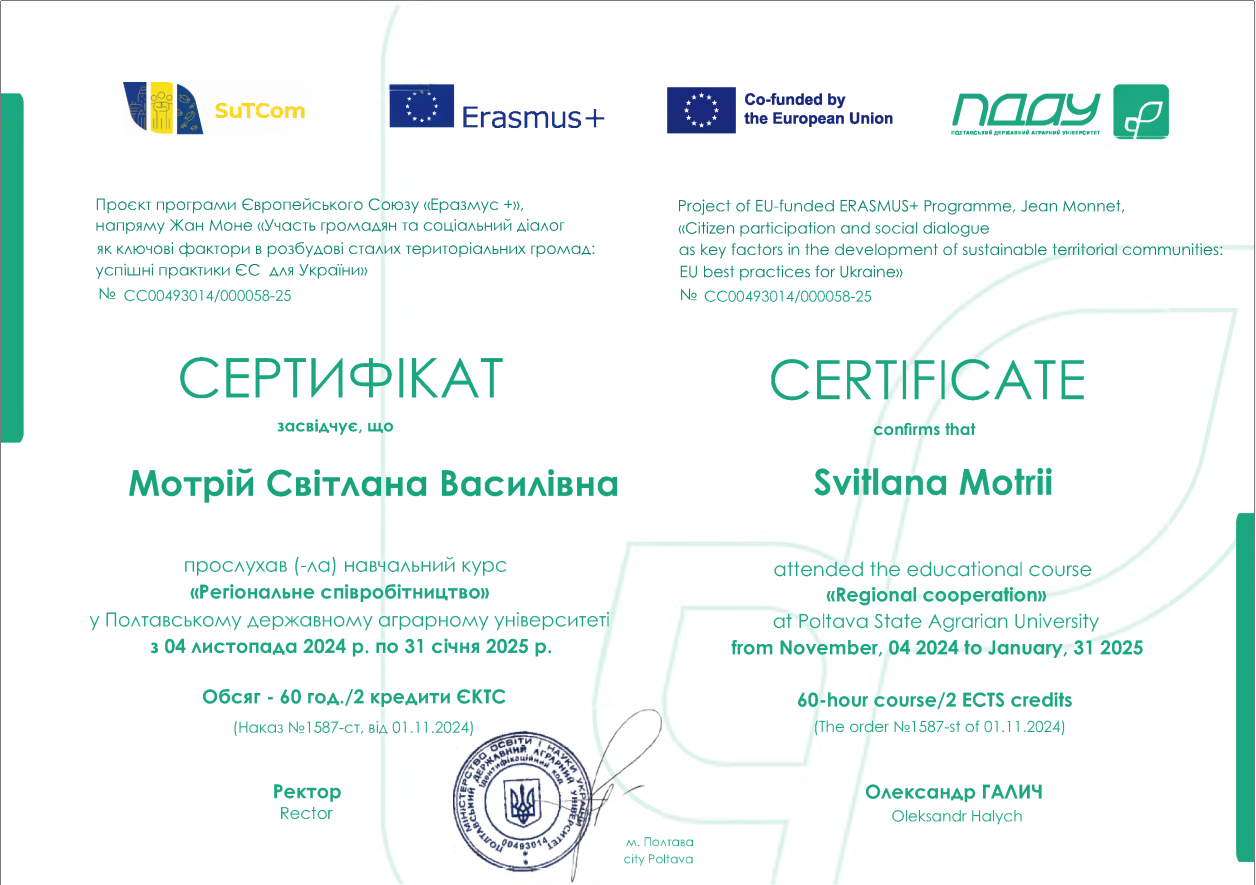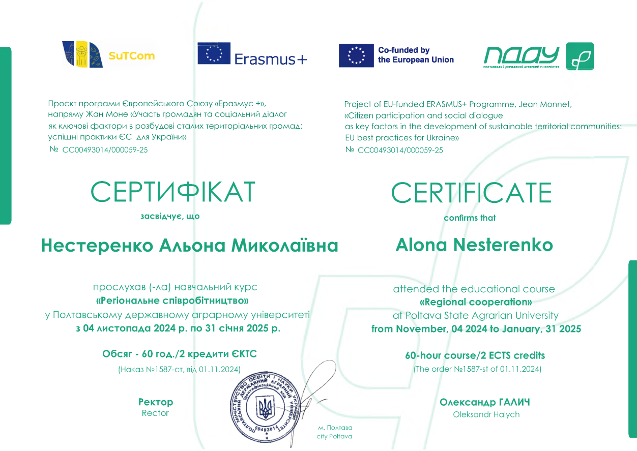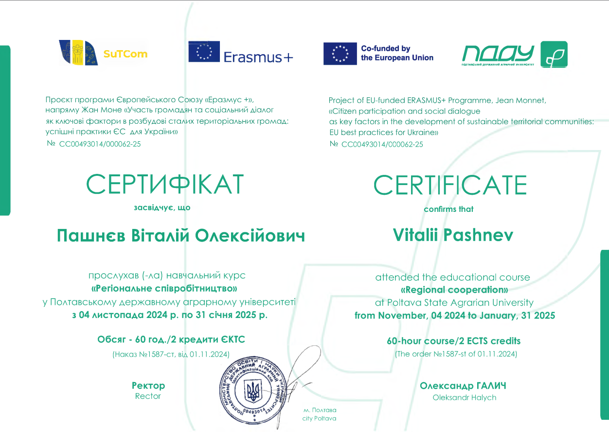• Здобувачі вищої освіти СВО Доктор філософії ОНП Публічне управління та адміністрування прослухали навчальний курс "Регіональне співробітництво" у ПДАУ з 04 листопада 2024 року по 31 січня 2025 року. Обсяг - 60 год / 2 кредити ЕКТС (Проєкт програми Європейського Союзу «Еразмус +», напряму Жан Моне «Участь громадян та соціальний діалог як ключові фактори в розбудові сталих територіальних громад: успішні практики ЄС для України»).