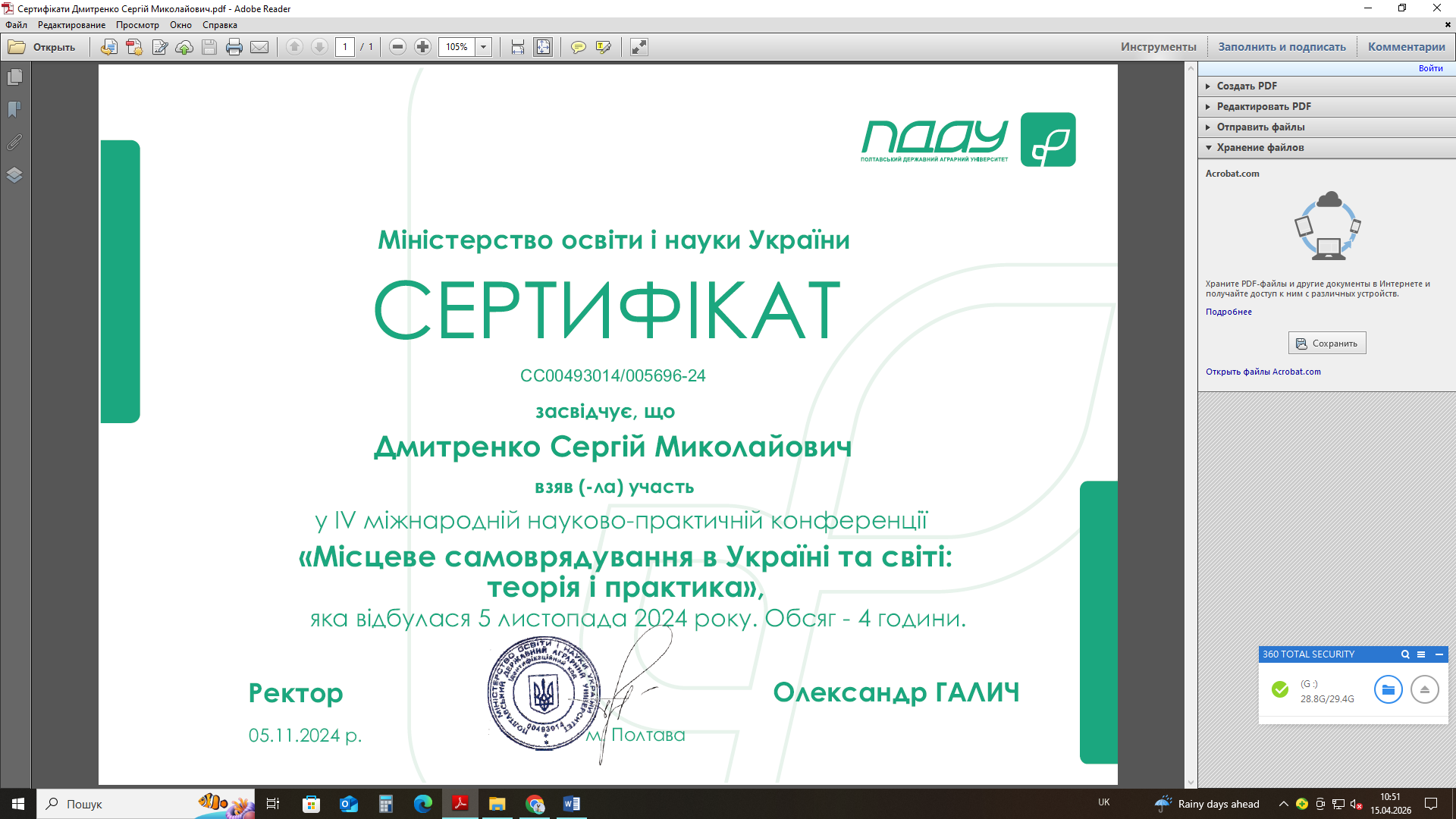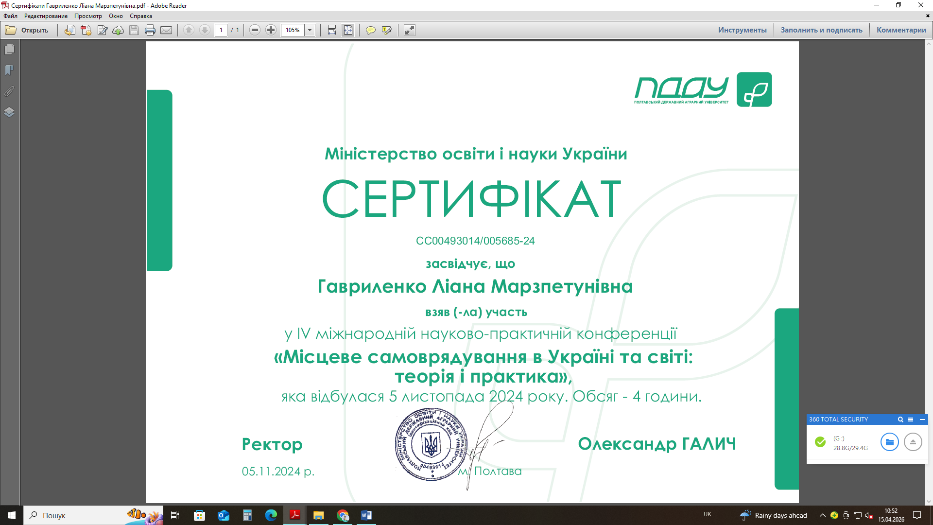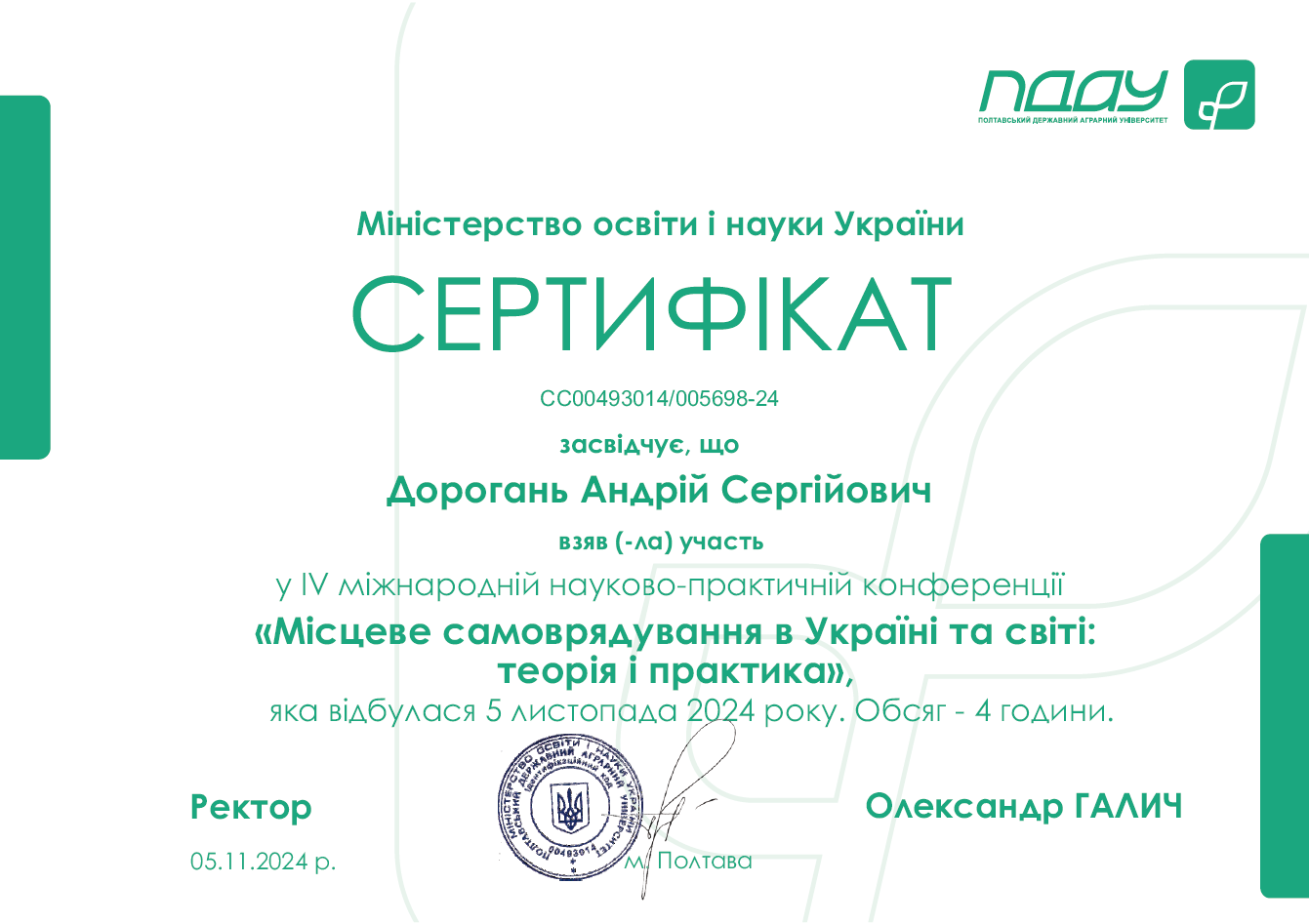 • Здобувачі вищої освіти СВО Доктор філософії ОНП Публічне управління та адміністрування стали учасгниками ІV Міжнародна науково-практичної конференції "Місцеве самоврядування в Україні та світі: теорія і практика", м. Полтава, 5 листопада 2024 року.