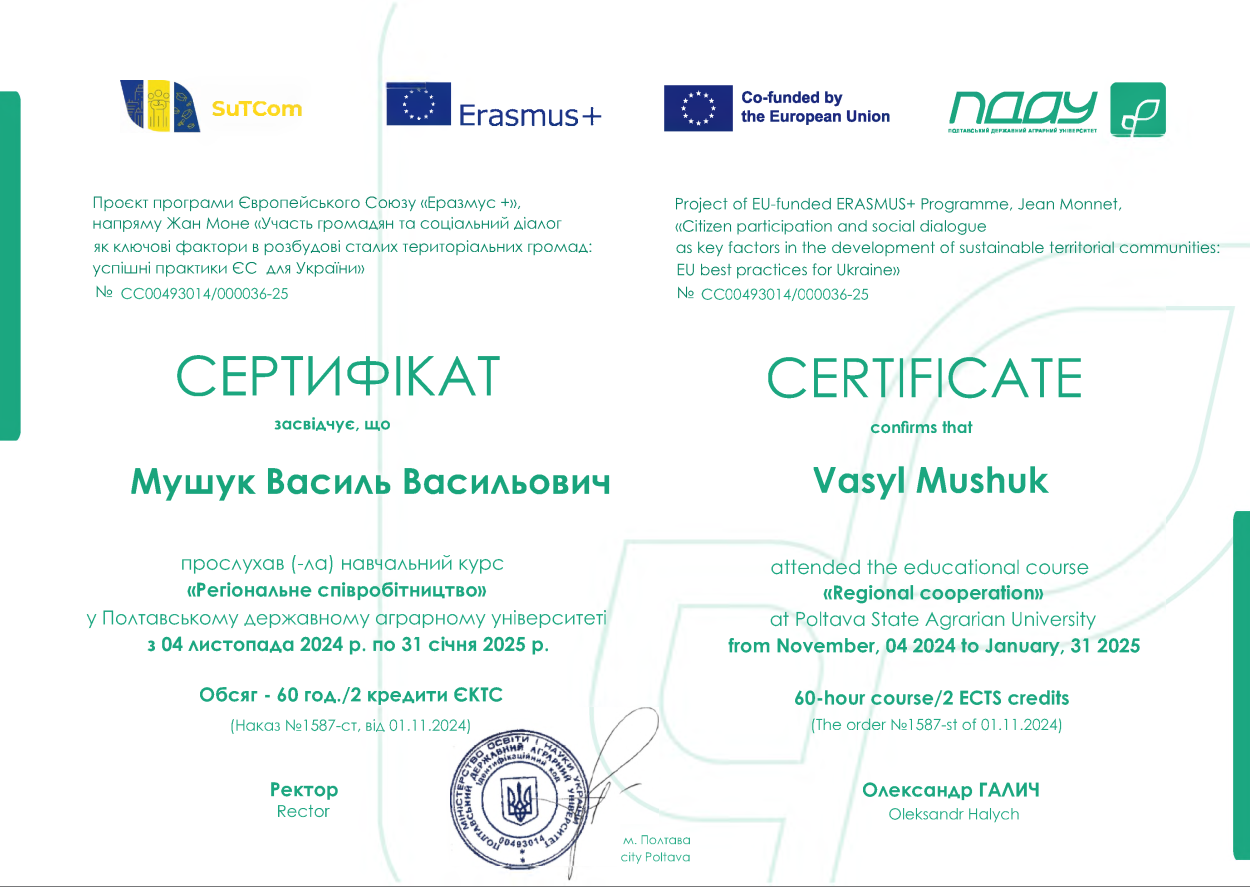 • Мушук Василь Васильович за частиною ОК «Класичні та сучасні теорії публічного управління» (протокол, сертифікат)