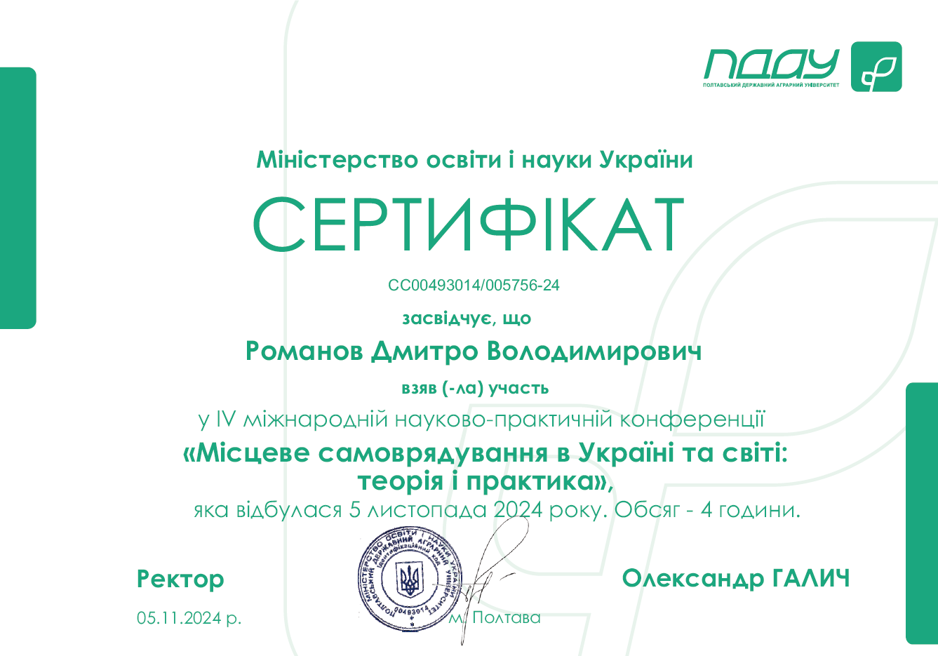 • Романов Д. В., визнання за частиною ОК «Методологія та організація досліджень в сфері публічного управління та адміністрування, тема «Особливості проведення дослідження в сфері публічного управління» (60 год., сертифікат, сертифікат)