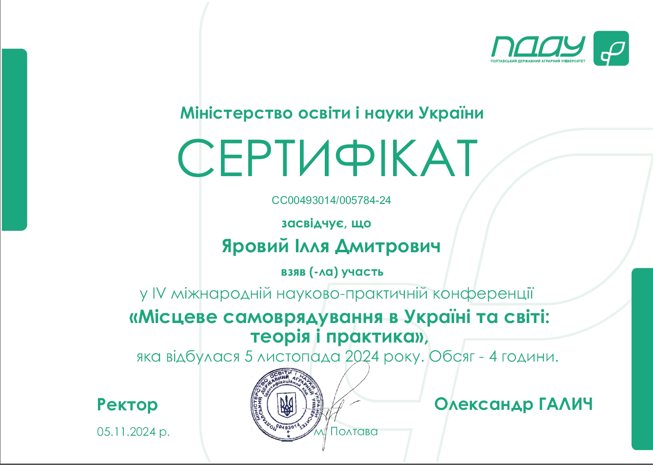 • Здобувач вищої освіти СВО Доктор філософії Іван Олексій взяв участь у Міжнародній науково-практичній конференції "Від теорії до практики в управлінні та врядуванні" (м. Киїів, НУБІП). Сертифікат № 48 від 20.06.2024 (6 год. / 0,2 кредиту ЄКТС)., м. Харків, 24.05.2024 (0,5 кредити ЄКТС).