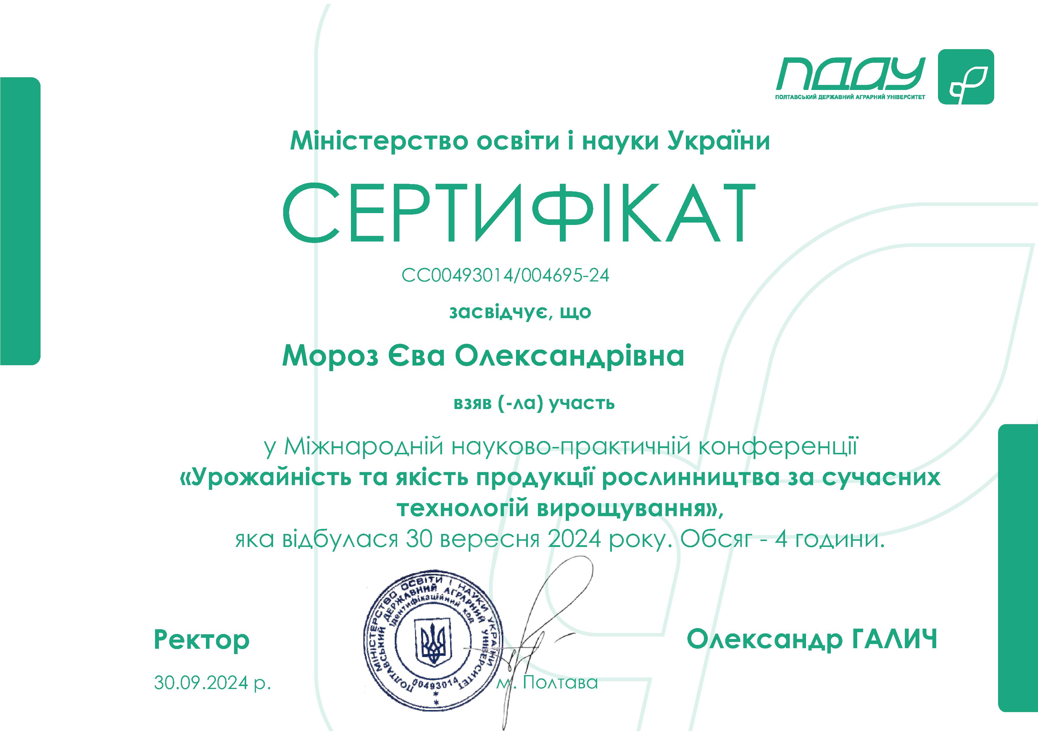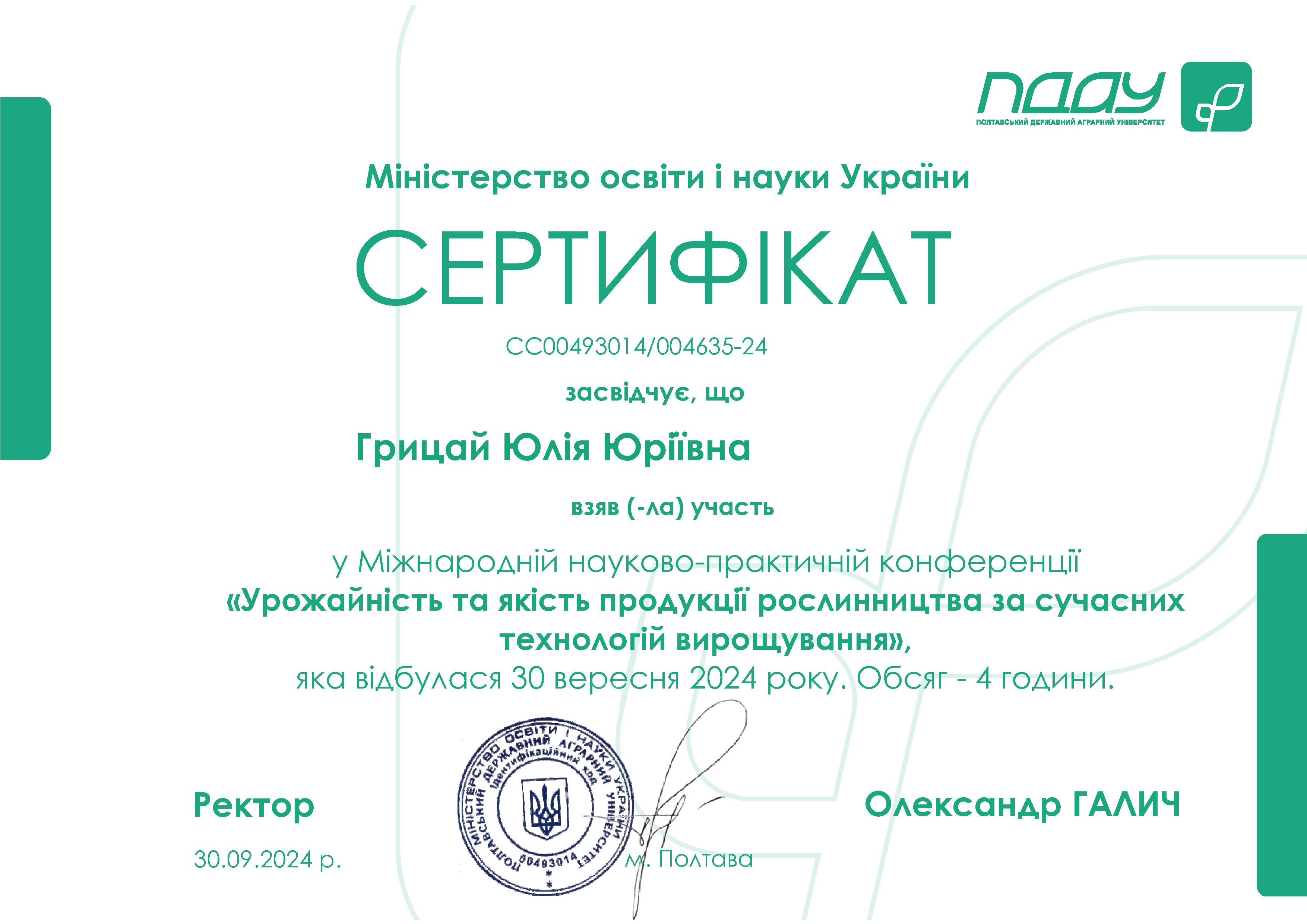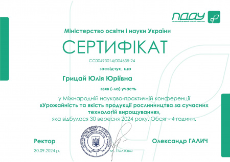 Участь у конференції "Урожайність та якість продукції рослинництва за сучасних технологій вирощування" (2024 р)