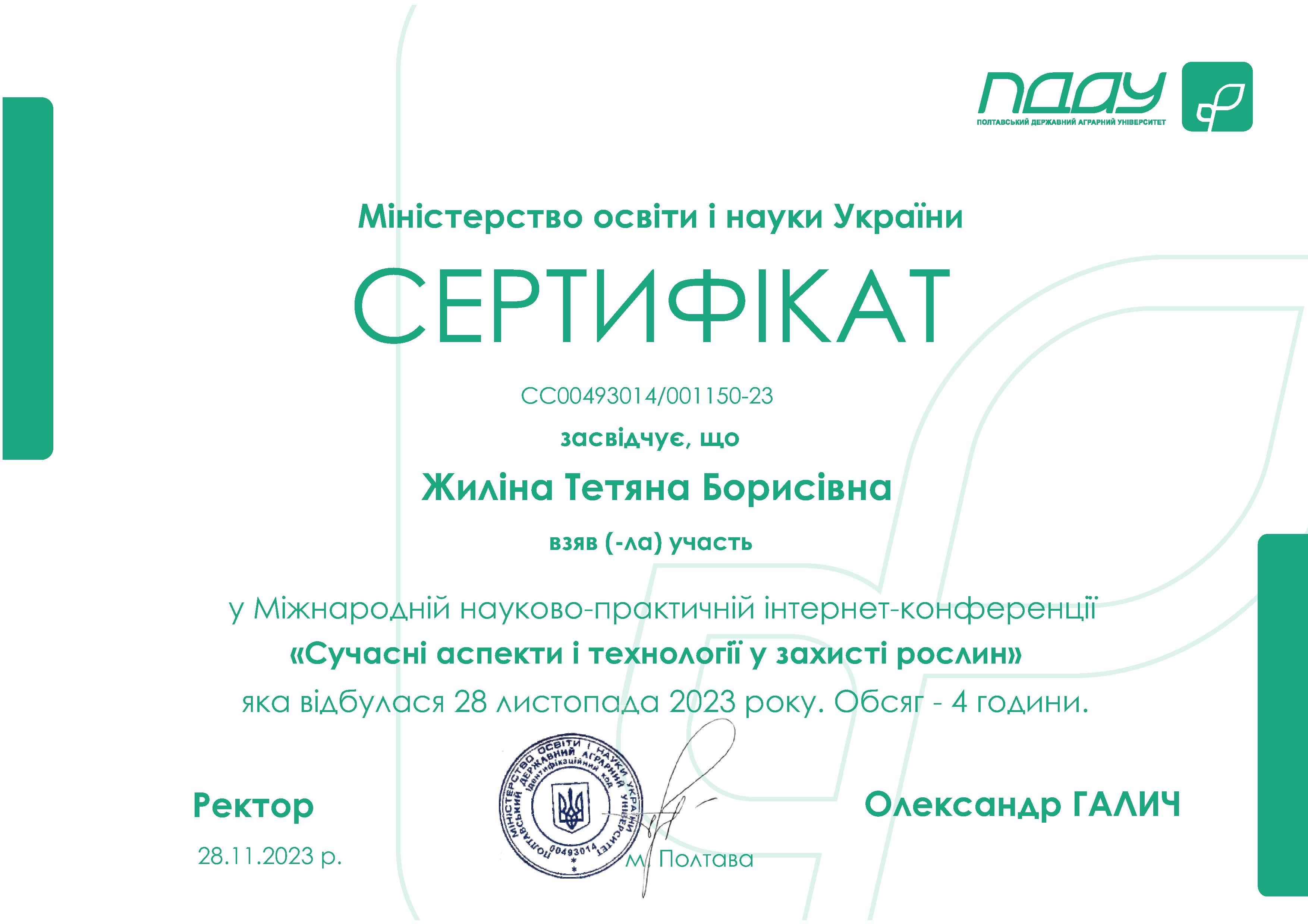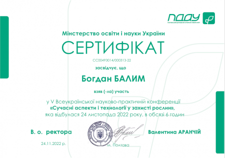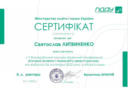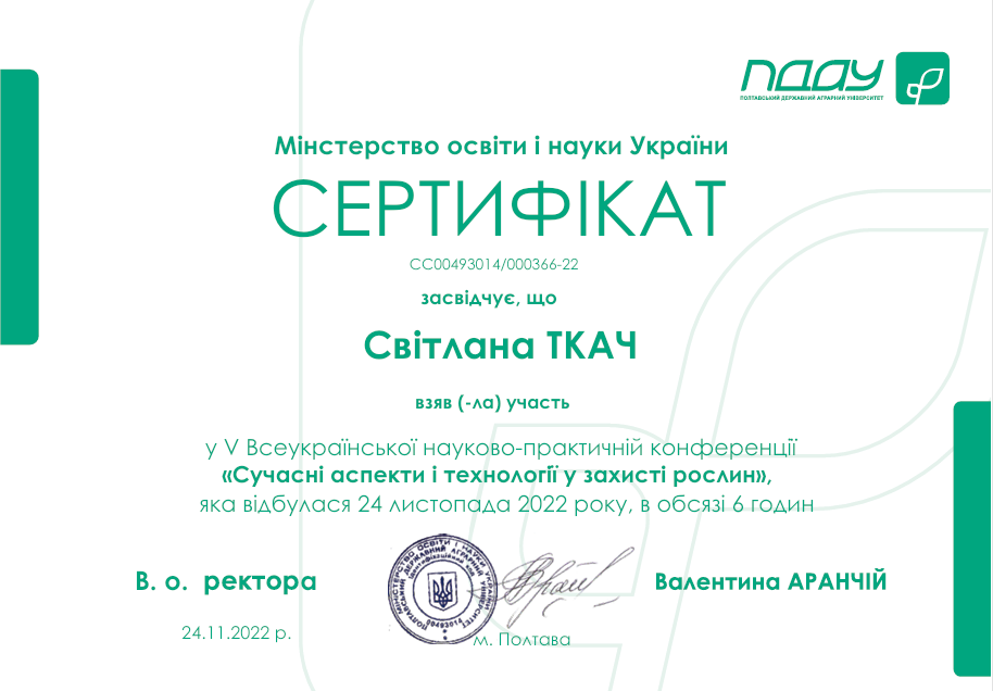 Визнання результатів навчання за частиною ОК "Сільськогосподарська фітопатологія" (сертифікат, протокол)