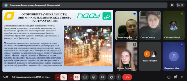 До учасників засідання з вступним словом звернувся декан факультету обліку та фінансів, гарант ОПП Фінанси, банківська справа та страхування першого (бакалаврського) рівня вищої освіти Олександр Безкровний. Він подякував за бажання всіх гостей зустрічі зробити освітні програми кращими. Також він представив основні характеристики та зміни освітньо-професійної програми, гарантом якої являється.
