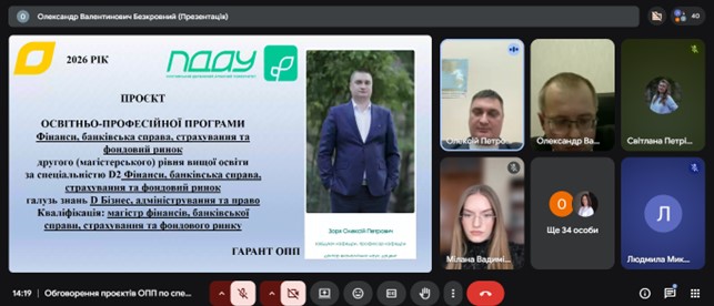 12 лютого 2026 року на кафедрі фінансів, економічних досліджень і туризму відбулось розширене засідання кафедри та робочих груп - розробників освітніх програм Фінанси, банківська справа та страхування першого (бакалаврського) рівня вищої освіти і Фінанси, банківська справа, страхування та фондовий ринок другого (магістерського) рівня вищої освіти.