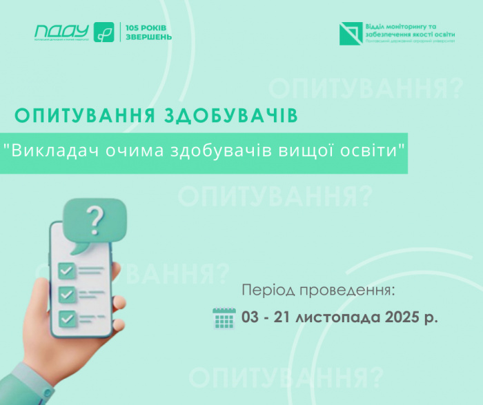 Запрошуємо вас взяти участь в онлайн-анкетуванні "Викладач очима здобувачів вищої освіти", яке буде проводитися з 03 по 21 листопада 2025 року. Це ваша можливість висловити думку щодо якості викладання та вплинути на якість освітнього процесу в Університеті. Анкета є анонімною, а результати будуть використані виключно в узагальненому вигляді. Ваша думка є надзвичайно важливою для нас!