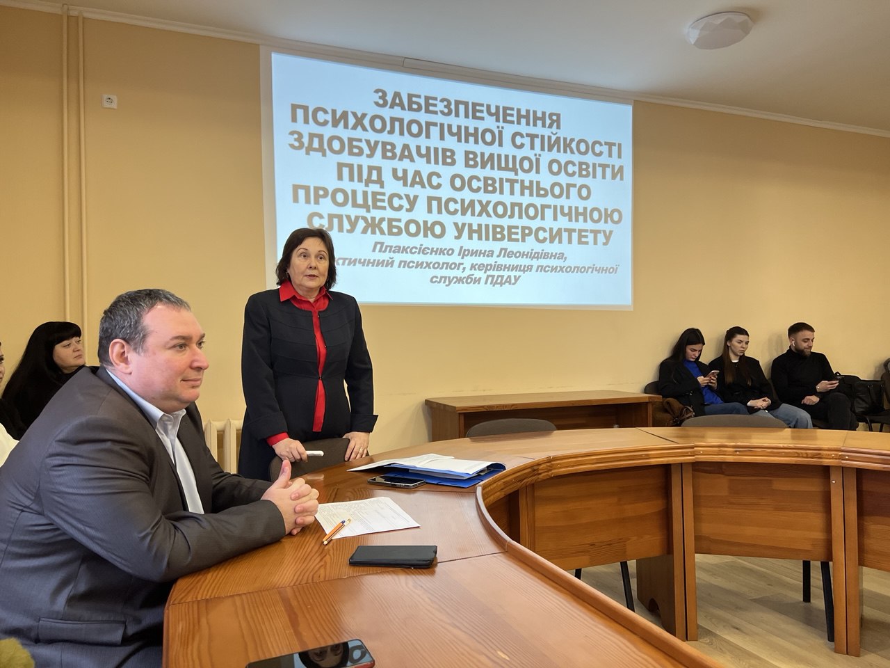 Першим питанням порядку денного засідання була доповідь керівниці психологічної служби Ірина Плаксієнко «Забезпечення психологічної стійкості здобувачів вищої освіти під час освітнього процесу психологічною службою університету».