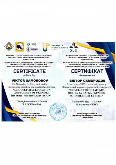 Писаренко Віктор, завідувач кафедри, доктор сільськогосподарських наук та асистент, здобувач вищої освіти доктора філософії Логвиненко Вадим взяли участь у ІІ Всеукраїнській науково-практичній конференції «АКТУАЛЬНІ ПРОБЛЕМИ СУЧАСНОЇ НАУКИ: ТЕОРЕТИЧНІ ТА ПРАКТИЧНІ ДОСЛІДЖЕННЯ МОЛОДИХ УЧЕНИХ»