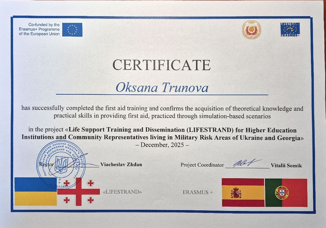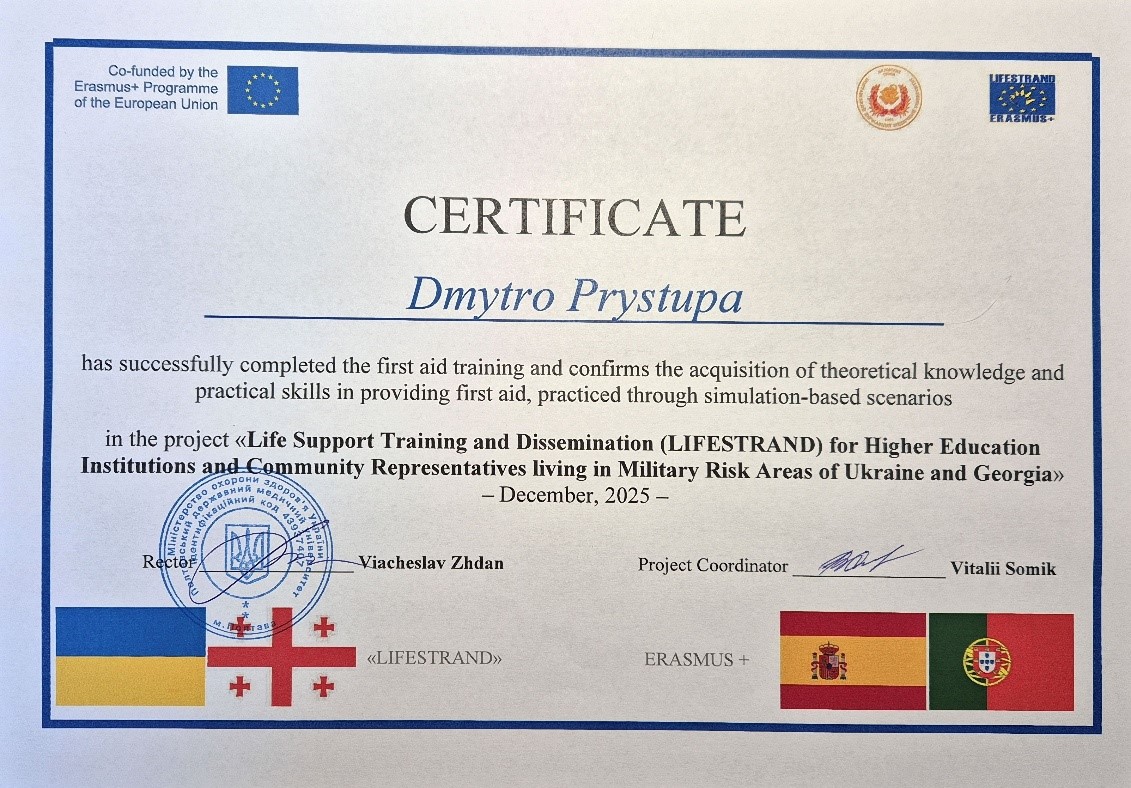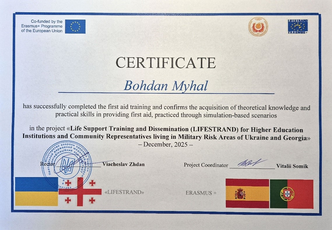 У грудні 2025 року студенти ОП «Сільськогосподарське будівництво» Дмитро ПІНЧУК, Дмитро ПРИСТУПА, Богдан МИГАЛЬ, Оксана ТРУНОВА успішно завершили тренінг з надання домедичної допомоги в межах проєкту, що реалізується за підтримки програми ERASMUS+КА2 Європейського Союзу.