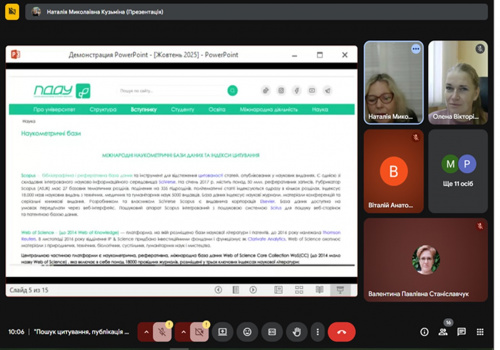 Були розглянуті стратегії пошуку наукової інформації у найбільших світових наукометричних базах, таких як Scopus та Web of Science. Обговорювалися правила доступу до баз, а також можливість налаштування віддаленого доступу. Окремим блоком стало питання створення та використання ідентифікатора науковця ORCID — "цифрового паспорта" у світі наук.