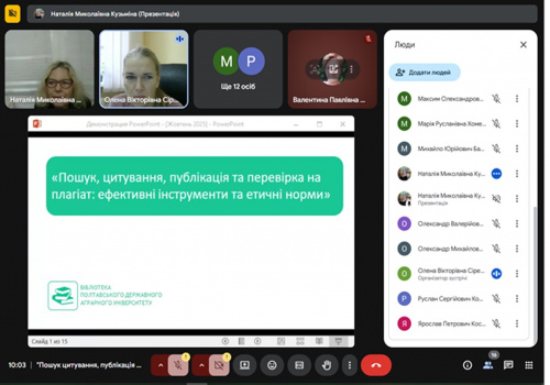 24 жовтня відділ аспірантури і докторантури спільно з Бібліотекою Полтавського державного аграрного університету організували та успішно провели Практичний вебінар для аспірантів на тему: «Пошук, цитування, публікація та перевірка на плагіат: Ефективні інструменти та етичні норми».
