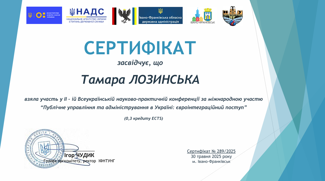Всеукраїнська науково-практична конференція за міжнародною участю "Публічне управління та адміністрування в Україні: євроінтеграційний поступ", м. Івано-Франківськ, 30 травня 2025. Сертифікат № 217/2025 (0,3 кредити ЄКТС).