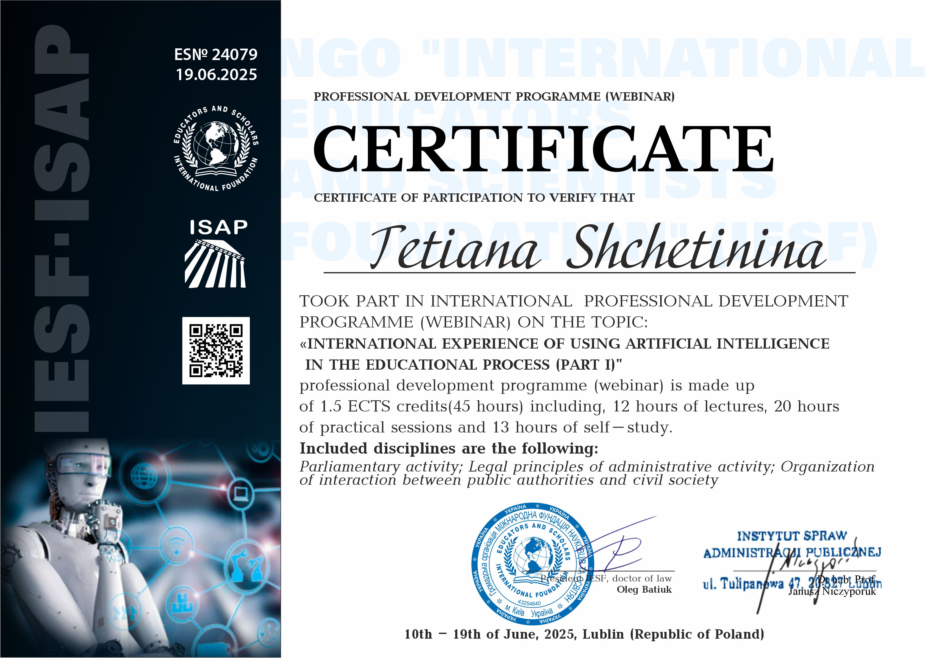 Полтавська державна аграрна академія. Тема «Вища освіта: проблеми і шляхи забезпечення якості у контексті сучасних трансформацій», 26-27.02.20. Сертифікат СС 00493014/000171-20 (12 год. / 0,4 кредиту ЄКТС). Національний університет біоресурсів і природокористування. Тема «Інноваційна спрямованість педагогічної діяльності», 28.02.20. Свідоцтво про підвищення кваліфікації СС 00493706/011392-20. Наказ № 109-к від 17.02.20 (90 год / 3 кредити ЄКТС). Комунальна установа «АГЕНЦІЯ МІСЦЕВОГО РОЗВИТКУ ТЕРИТОРІАЛЬНИХ ГРОМАД ПОЛТАВСЬКОГО РАЙОНУ». Науково-практичний семінар «СКЛАДАННЯ ПРОЄКТНИХ ЗАЯВОК» для участі в «Програмі малих грантів публічної дипломатії – академічні та освітні програми» (Program: Ukraine: U.S. Government Public Diplomacy Small Grants Program – Academic and Educational Programs), сертифікат ПК 42254455/000009-20 від 05.03.20 (визнано Вченою радою ПДАА, протокол 27 від 01.07.20 (9 год. / 0,3 кредиту ЄКТС)). The X International Science Conference «Science foundations of modern science and practice», November 23 – 26, 2021, Athens, Greece / Х Міжнародна наукова конференція «Наукові основи сучасної науки і практики» (23-26.2021., м. Афіни, Греція).Тема доповіді – «Публічна (громадська) безпека: історіографія питання». Сертифікат учасника. 24 години (0,8 кредити ЄКТС) (визнано вченою радою ННІ ЕУПІТ від 24.12.2021, протокол № 5). XI Міжнародна науково-практична конференція «Actual problems of learning and teaching methods / Актуальні проблеми викладання та методики навчання», 06-09 грудня 2022 р. Тема доповіді - "Комунікація місцевої влади з громадськістю: правові засади". Відень, Австрія. Сертифікат учасника. 24 години (0,8 кредита ЄКТС) (визнано вченою радою ННІ ЕУПІТ від 19.12.2022, протокол № 4). Науково-дослідний інститут Люблінського науково-технологічного парку та IESF міжнародна фундація науковців та освітян, м. Люблін (Республіка Польща). Міжнародне підвищення кваліфікації (вебінар) на тему: «Академічна доброчесність при підготовці бакалаврів та магістрів в країнах Європейського Союзу та Україні», обсяг 1,5 кредити ЄКТС (45 год.). 30.01–06.02.2023. Сертифікат. XIV Міжнародна науково-практична конференція «Людина і світ: глобальні проблеми розвитку людства» (18-20 грудня 2023 року, Прага, Республіка Чехія). Сертифікат (12 год. / 0,4 кредити ЄКТС). Міжнародне дистанційне науково-педагогічне стажування «Публічне управління та адміністрування: досвід Європейського Союзу» в ISAP Інститут справ адміністрації публічної (Республіка Польща) та IESF «Міжнародна фундація науковців та освітян» (11.03.–10.05.2024). Сертифікат PL № 019-05-24 від 10.05.2024 (180 год. / 6 кредитів ЄКТС). МБФ «Міжнародний фонд досліджень освітньої політики», Полтавський державний аграрний університет, Полтавський університет економіки і торгівлі. Методичний тренінг «Новації в українській вищій освіті: можливості, рамки, перспективи». МБФ «Міжнародний фонд досліджень освітньої політики», ПДАУ, ПУЕТ. 20-21.02.2025. Сертифікат СС00493014/000632-25 (30 год. / 1,0 кредит ЄКТС). ISAP Інститут справ адміністрації публічної та IESF Міжнародна фундація науковців та освітян (Україна). Міжнародне підвищення кваліфікації (вебінар) на тему «Міжнародний досвід використання штучного інтелекту в освітньому процесі (частина І)» (11-19 червня 2025 року, Республіка Польща). Сертифікат ES № 24079 від 19.06.2025 (45 год. / 1,5 кредити ЄКТС). |