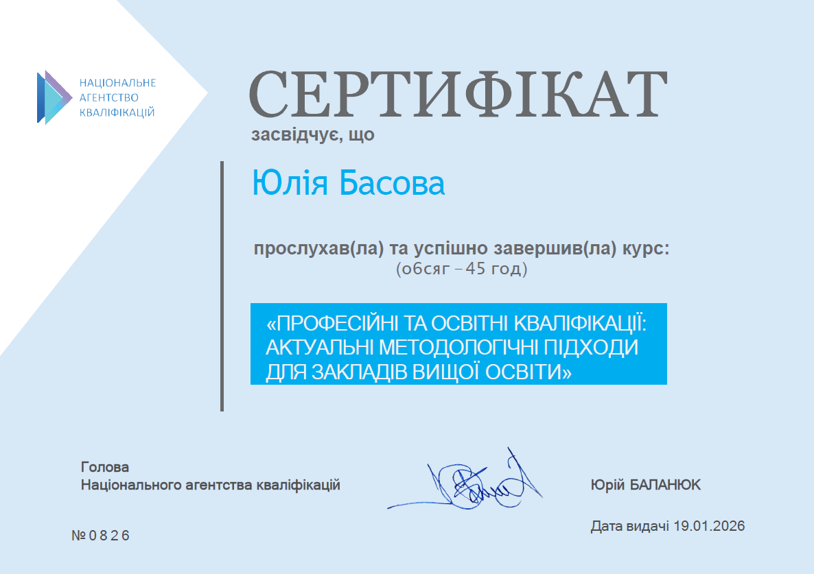 Доцентка кафедри механічної та електричної інженерії Басова Юлія протягом 3 грудня 2025 року – 9 січня 2026 року проходила підвищення кваліфікації у межах курсу «Професійні та освітні кваліфікації: актуальні методологічні підходи для закладів вищої освіти», організованого Національним агентством кваліфікацій.