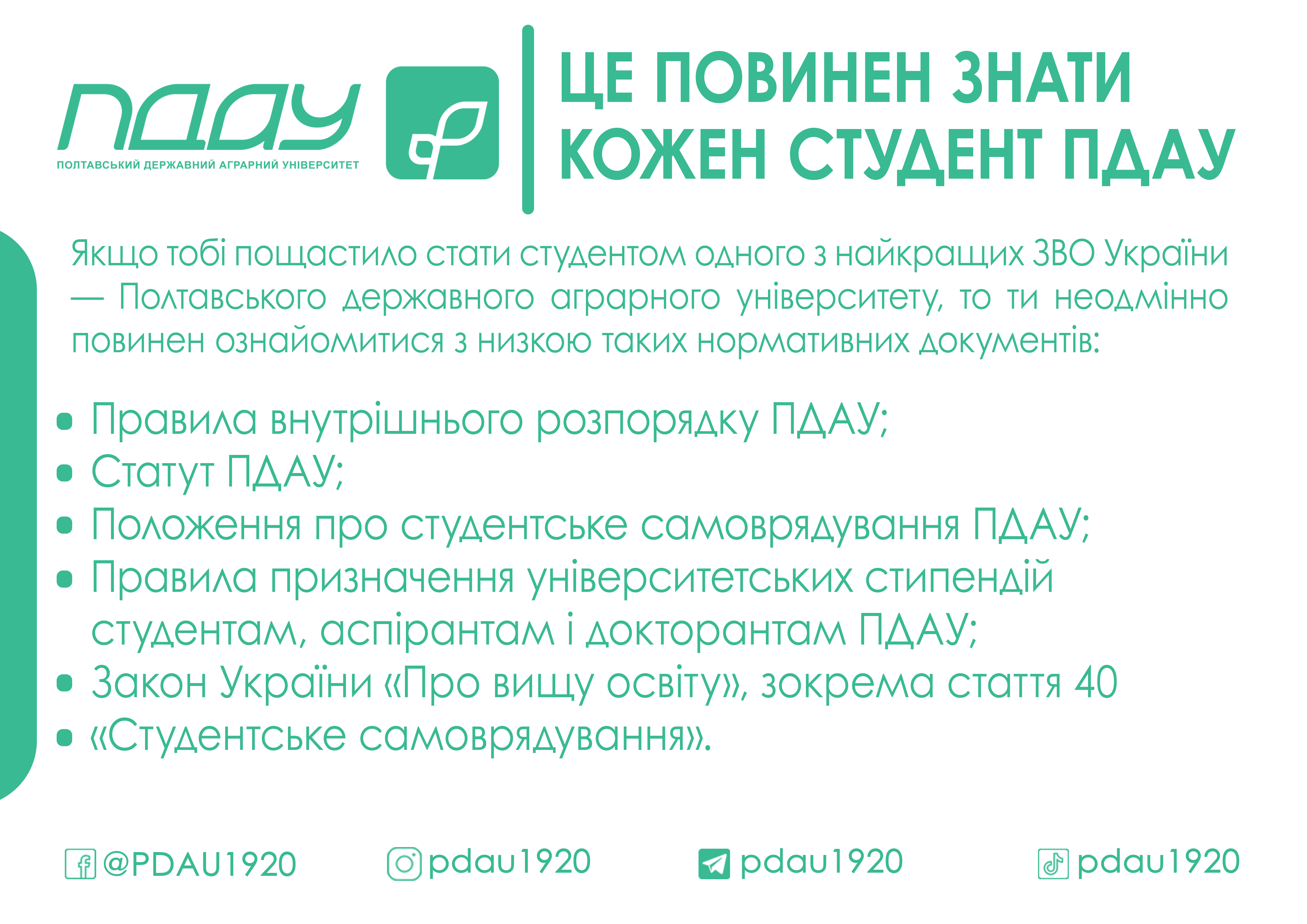 Правила внутрішнього розпорядку ПДАУ Статут ПДАУ Положення про Студентське самоврядування ПДАУ Правила призначення академічних стипендій студентам, аспірантам та докторантам ПДАУ Закон України «Про вищу освіту» та стаття 40 «Про Студентське самоврядування»