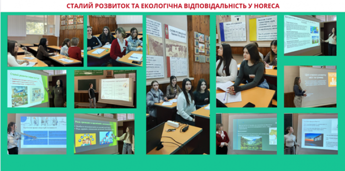 Студенти досліджували приклади впровадження зелених технологій, zero-waste практик, повторного використання сировини, сортування відходів у закладах громадського харчування, використання локальних продуктів і сезонних меню для поліпшення харчування. Важливою темою стало й обговорення умов правці у HoReCa, зростання популярності зеленого туризму, як напрямку, що гармонійно поєднує природу, культуру та гастрономічний досвід. Йшлося про екосадиби, локальні ферми, гастромаршрути у сільській місцевості та роль закладів HoReCa у підтримці екологічної туристичної інфраструктури.
