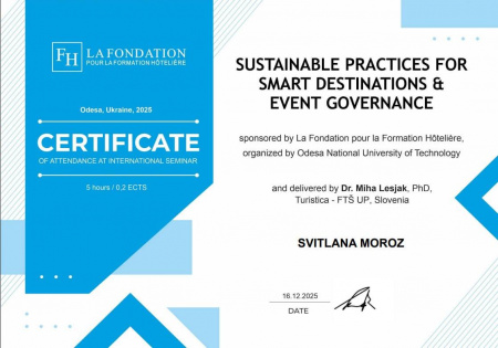 Викладачі кафедри харчових технологій долучилися до міжнародного семінару «Sustainable Practices for Smart Destinations & Event Governance», що відбувся 16 грудня 2025 року. Лекцію провів Dr Miha Lesjak (Словенія) – фахівець у сфері сталого розвитку туризму, управління подіями та формування smart-дестинацій.