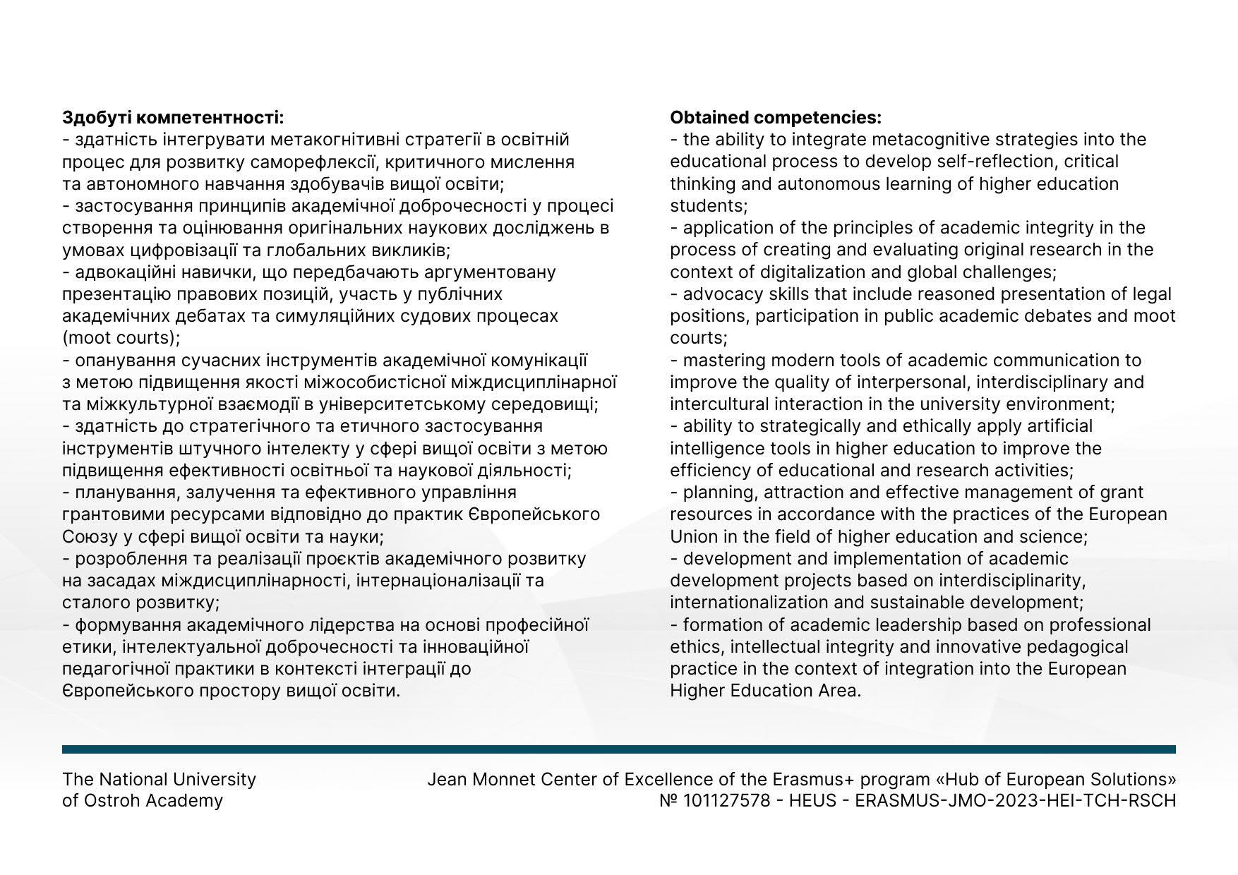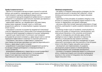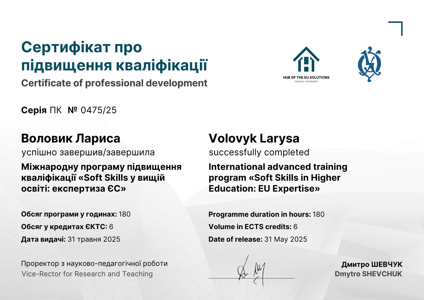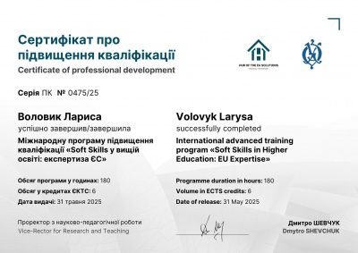 Доцентка кафедри германської і української філології Воловик Лариса Борисівна пройшла науково-педагогічне стажування в Національному університеті «Острозька академія», що підтверджується свідоцтвом про підвищення кваліфікації ПК № 0475/25 від 31.05.2025. Тема стажування: «Soft Skills у вищій освіті: експертиза ЄС», загальний обсяг: 180 годин. Метою стажування було поглиблення професійних компетентностей викладача шляхом ознайомлення з європейським досвідом формування та розвитку soft skills у системі вищої освіти. У процесі стажування було опрацьовано сучасні підходи ЄС до розвитку критичного мислення, ефективної комунікації, командної взаємодії, лідерських якостей, міжкультурної компетентності та навичок академічної доброчесності. Особливу увагу приділено впровадженню інтерактивних методів викладання, проєктної діяльності та сучасних підходів до оцінювання результатів навчання відповідно до європейських стандартів забезпечення якості освіти.