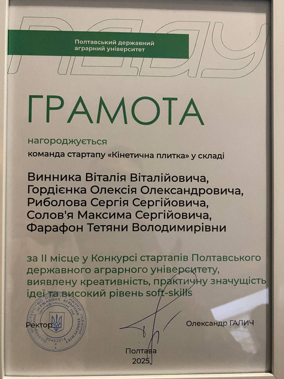 Щиро вітаємо Олексія Гордієнка та всю команду «Кінетична плитка» із заслуженим другим місцем! Бажаємо нових ідей, натхнення та подальших успіхів у реалізації технологічних рішень, що змінюють майбутнє!