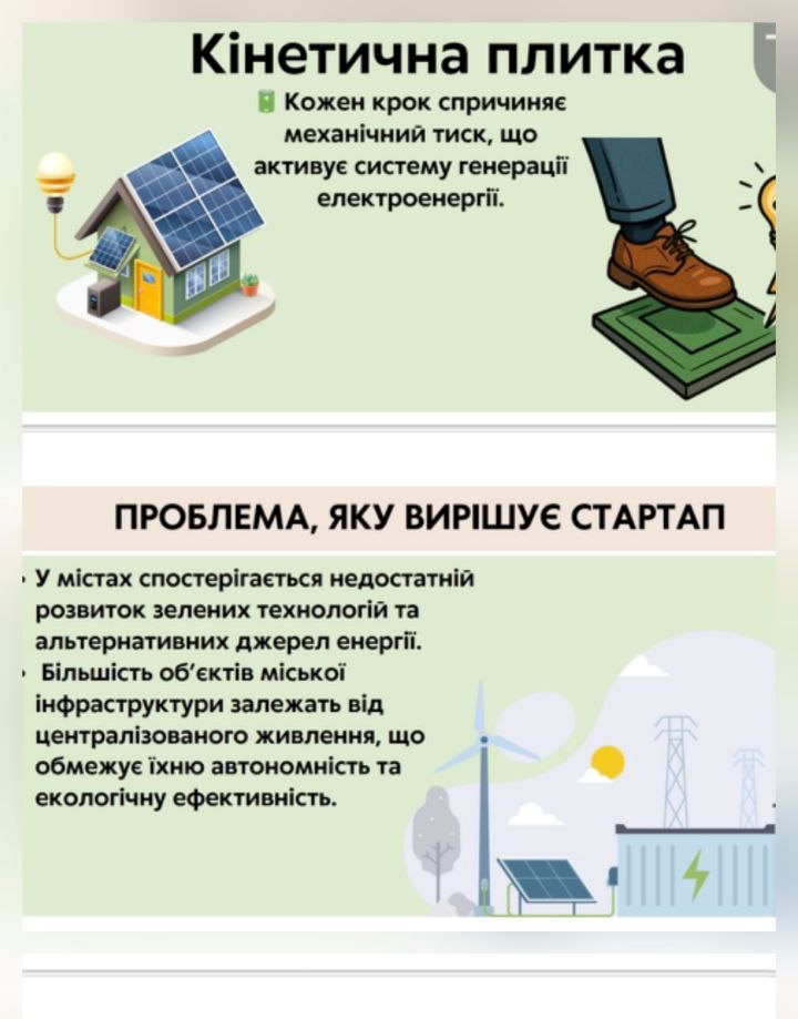 Цей проєкт продемонстрував високий рівень інноваційності та практичної цінності: команда запропонувала рішення, що дозволяє перетворювати механічну енергію кроків на електричну. Ідею високо оцінило журі конкурсу за її технологічність, якісну презентацію та сильний командний підхід.
