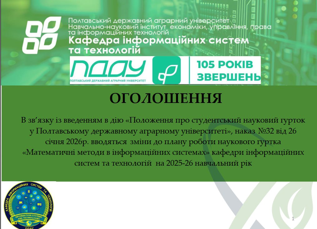 ПЛАН роботи студентського наукового гуртка «Математичні методи в інформаційних системах» кафедри інформаційних систем та технологій на 2025-2026 навчальний рік