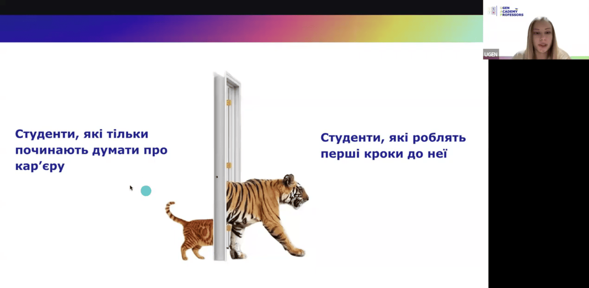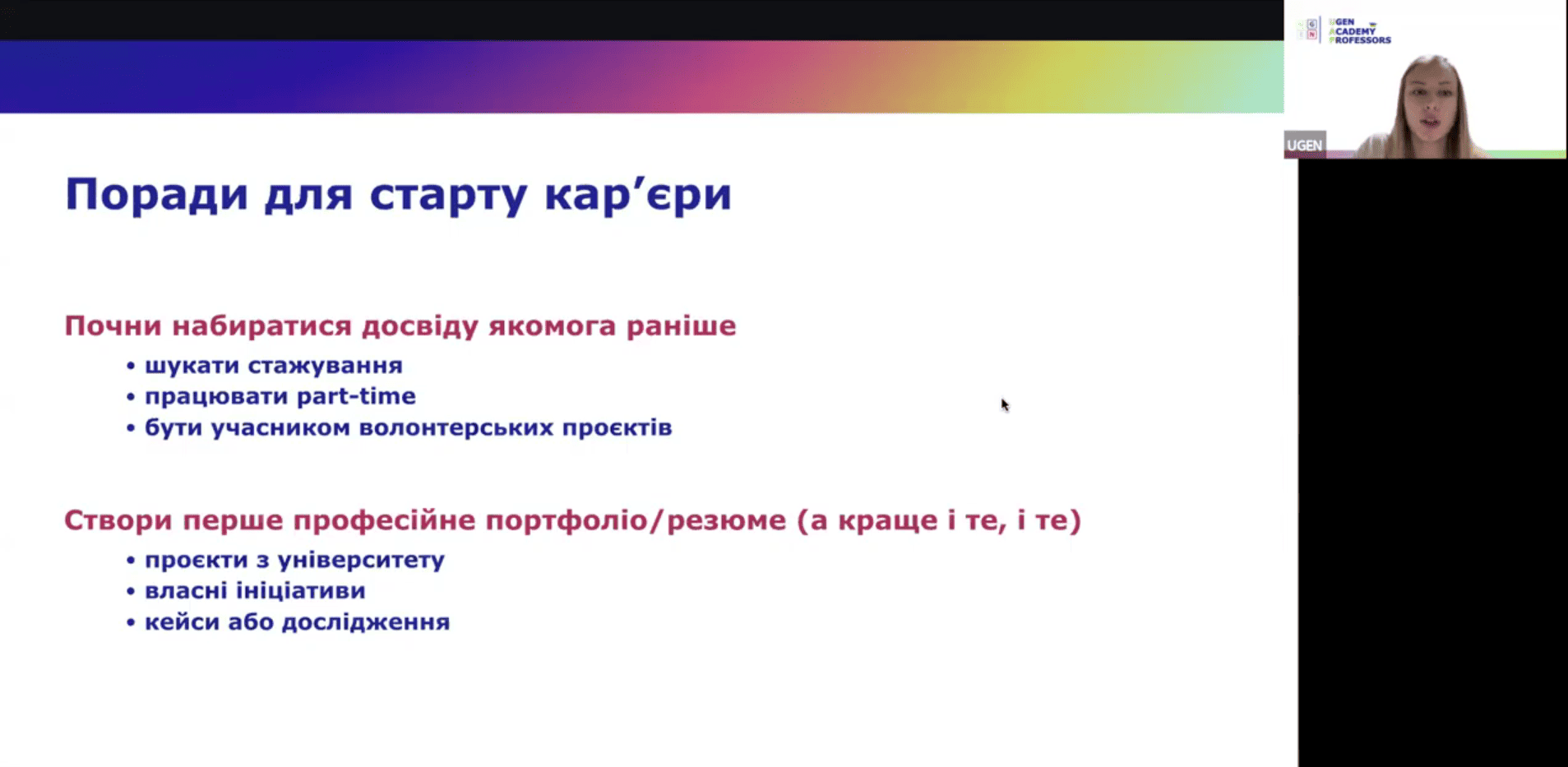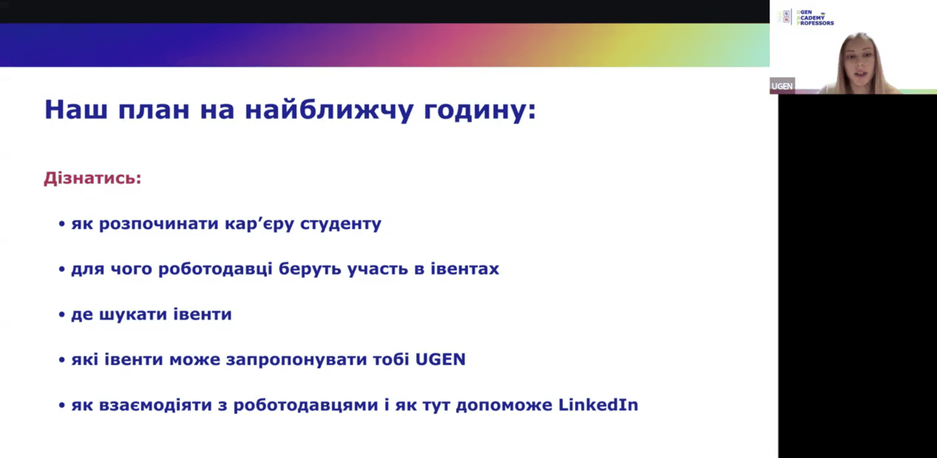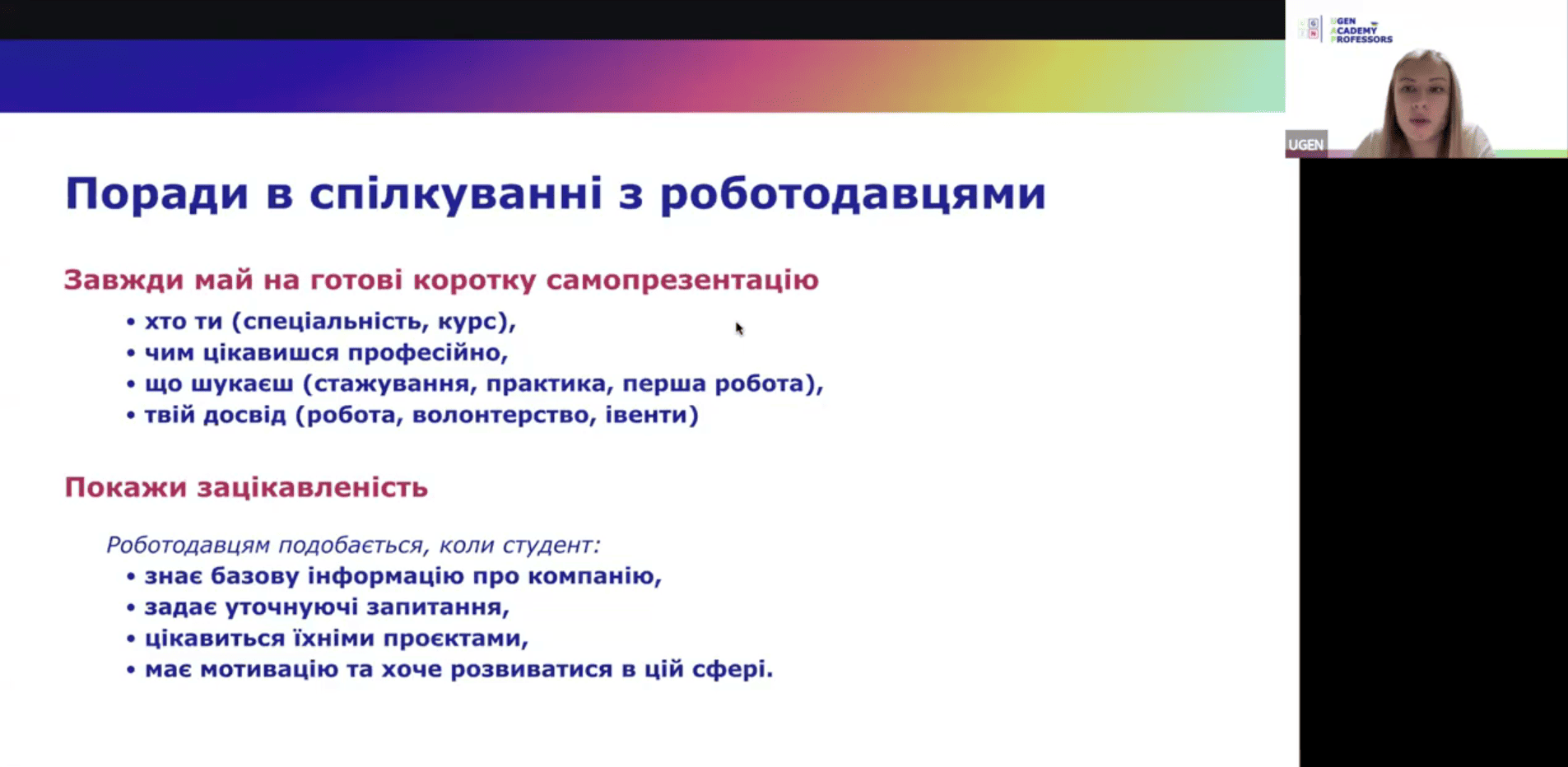 Студенти Полтавського державного аграрного університету долучилися до практичного вебінару від команди UGEN. Головна тема зустрічі – як правильно використовувати кар’єрні заходи, щоб знайти роботу. Спікерка Віолетта Журба розповіла, як звичайне знайомство з роботодавцем може перетворитися на реальну пропозицію працевлаштування.