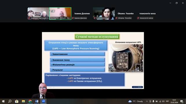 Під час лекції було розглянуто інноваційні стресостійкі технології передзабійної підготовки птиці, що спрямовані на мінімізацію біохімічних змін у м’язовій тканині, збереження високих показників якості м’яса та підвищення рівня добробуту тварин. Окрему увагу лектор приділив питанням автоматизації виробничих процесів — від первинної обробки до пакування готової продукції. Було продемонстровано приклади сучасного обладнання, роботизованих ліній та систем контролю якості, які дозволяють підвищити ефективність виробництва, зменшити вплив людського фактора та забезпечити стабільність технологічних параметрів.