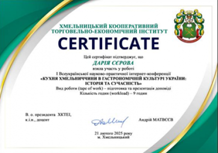 Так називається доповідь студентки першого курсу спеціальності «Готельно-ресторанна справа» Полтавського державного аграрного університету Дарії Сєрової. Студентка є активним членом гуртка «Зірки HoReCa» і завжди бере активну участь у наукових та творчих ініціативах, що популяризують національну кулінарну спадщину.