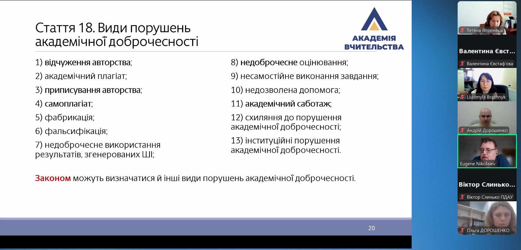Запрошеним спікером був Євген Ніколаєв, заступник директора ННІ «Академія вчительства» Харківського національного університету імені В. Н. Каразіна, один із розробників Закону України «Про академічну доброчесність». Він представив ґрунтовний аналіз підходів до впровадження його положень у практику організації освітнього процесу. На вебінарі було розглянуто ключові аспекти: нормативно-правові засади забезпечення академічної доброчесності; особливості імплементації положень нового закону у внутрішню систему забезпечення якості освіти; практичні інструменти запобігання порушенням академічної доброчесності; роль викладача та здобувача освіти у формуванні доброчесного освітнього середовища.