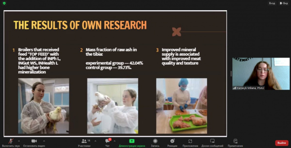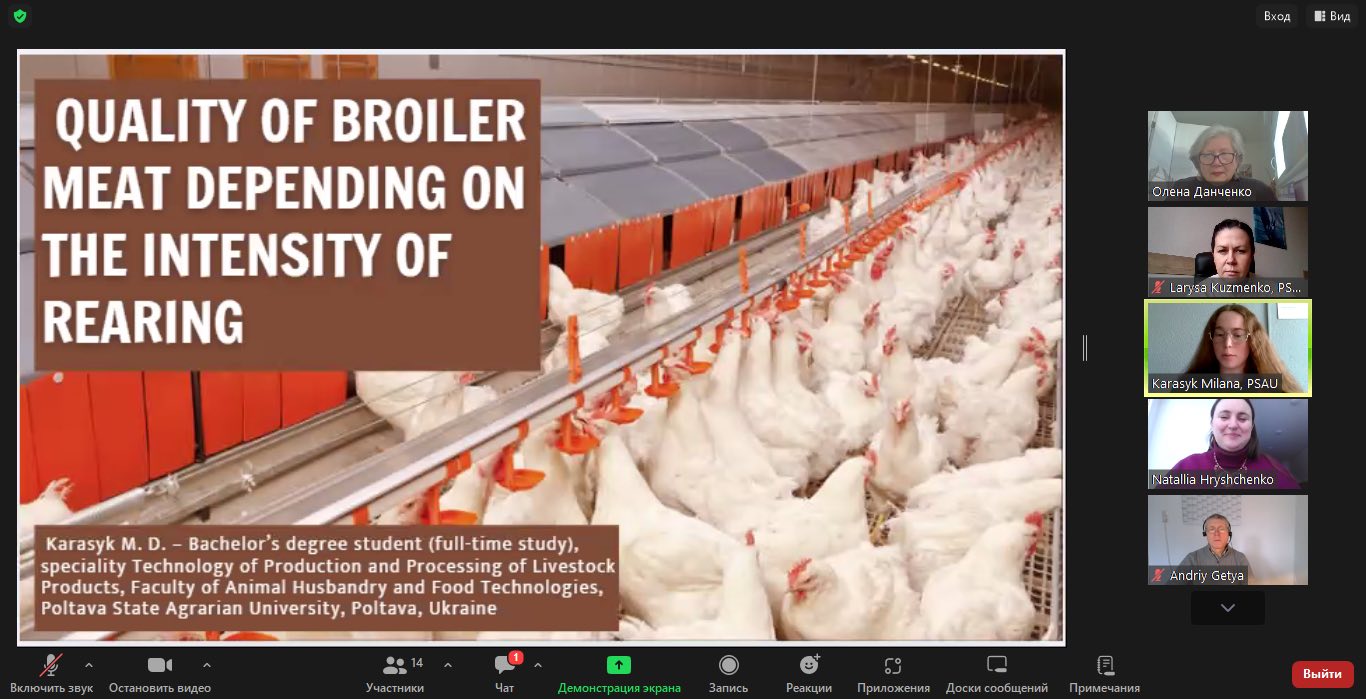 У конференції взяли участь НПП кафедри біології продуктивності тварин імені академіка О.В. Квасницького, а також здобувач вищої освіти ступеня бакалавра спеціальності 204 Технологія виробництва і переробки продукції тваринництва другого курсу Мілана Карасик, яка виступила з цікавою доповіддю на тему: “Quality of broiler meat depending on the intensity of rearing”.