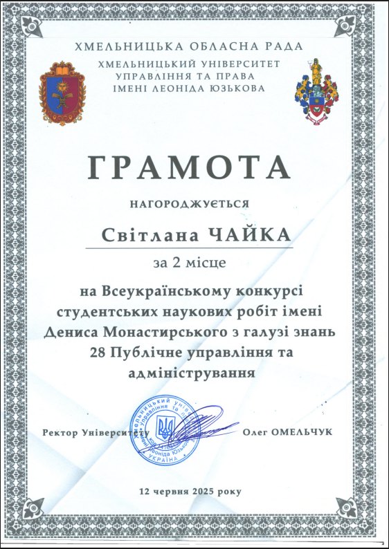 Чайка Світлана, здобувачка 1 курсу магістратури ОПП Зв’язки з громадськістю посіла ІІ місце у фінальному етапі Всеукраїнського конкурсу студентських наукових робіт імені Дениса Монастирського (у номінації «Публічне управління та адміністрування». Науковий керівник – Мирна Ольга, доцент кафедри публічного управління та адміністрування, кандидат економічних наук, доцент.