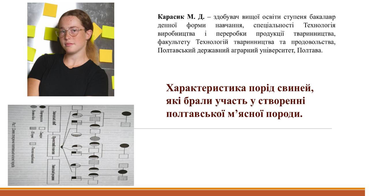 Здобувачка ступеня вищої освіти Бакалавр освітньої програми Технологія виробництва і переробки продукції тваринництва Мілана Карасик 02 грудня 2025 року виступила на засіданні круглого столу «Світло постаті доктора сільськогосподарських наук Броніслава Володимировича Баньковського: на посвяту 95-річчя від дня народження» з цікавою доповіддю на тему «ВИХІДНІ ПОРОДИ У СТВОРЕННІ ПОЛТАВСЬКОЇ М’ЯСНОЇ ПОРОДИ СВИНЕЙ».