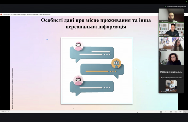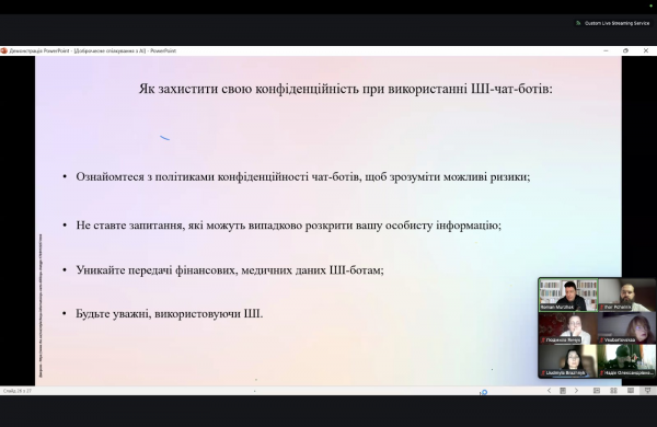 На заході було розглянуто питання: принципи доброчесного, етичного використання ШІ; які дані збирають чат-боти (на прикладі OpenAI); чим не варто ділитися з генеративними АІ-чат-ботами. Окрема увага буде приділена європейському та українському законодавству щодо регулювання використання штучного інтелекту. Спікером вебінару був Роман Муржак - учасник European Digital Education Hub, керівник гуртків «Цифрова грамотність» ХЦДЮТ, керівник і ініціатор інформаційно-просвітницької кампанії з медіаграмотності.