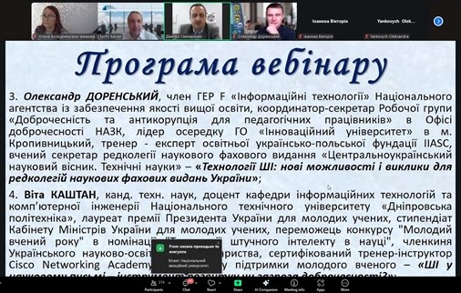 26 вересня 2025 року викладачі кафедри агроінженерії та автомобільного транспорту Горбенко Олександр та Іванкова Олена, разом із аспірантами та магістрантами кафедри, долучилися до актуального онлайн-заходу, присвяченого ролі штучного інтелекту в науці. Вебінар став важливою платформою для професійного діалогу між науковцями з різних куточків України.
