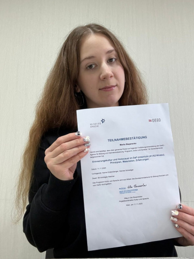 Студентка спеціальності «Філологія» Марія Степаненко взяла участь в онлайн-вебінарі «Erinnerungskultur und Holocaust im DaF-Unterricht (A1/A2-Niveau). Prinzipien, Materialien, Erfahrungen», організованому австрійськими науковцями.