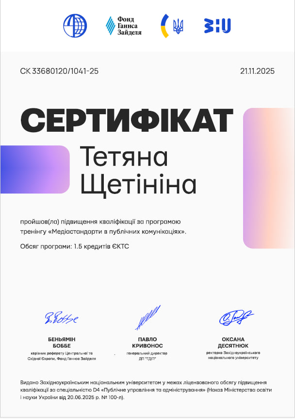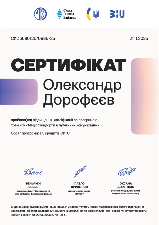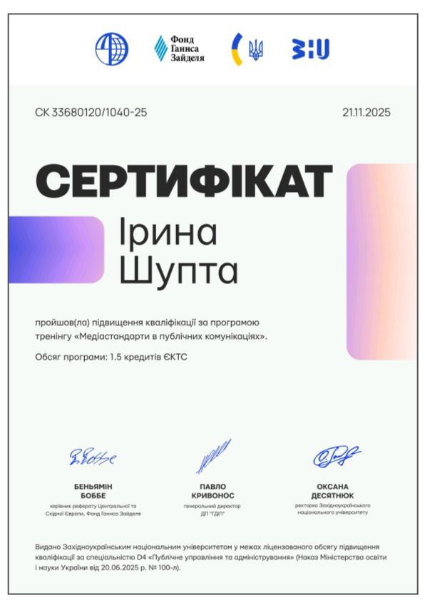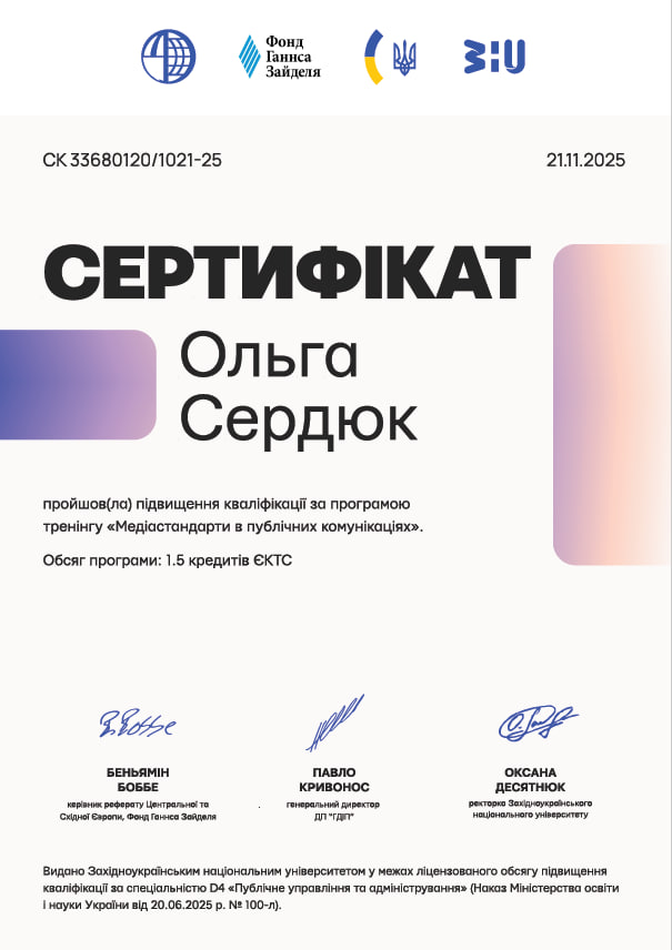Професори кафедри економіки та публічного управління Полтавського державного аграрного університету Олександр Дорофєєв та Ольга Сердюк, доценти Ірина Шупта та Тетяна Щетініна успішно завершили навчання за курсом підвищення кваліфікації «Медіастандарти в публічних комунікаціях», організованим за партнерства МЗС України, Західноукраїнського національного університету, ДП «ГДІП» за підтримки Фонду Ганнса Зайделя (27.10-14.11.2025).
