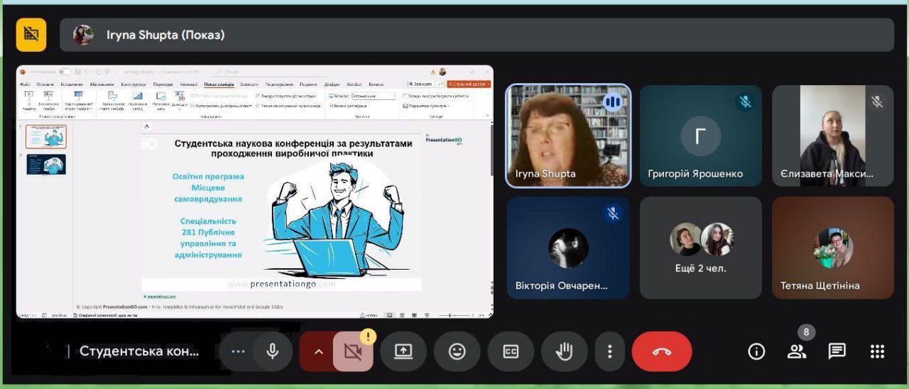 16.09.2025 Відбулося засідання студентського наукового гуртка «Територія науки» у форматі онлайн-конференції. Захід був присвячений обговоренню результатів виробничої практики студентів 3 курсу спеціальності 281 Публічне управління та адміністрування за освітньою програмою «Місцеве самоврядування». | |