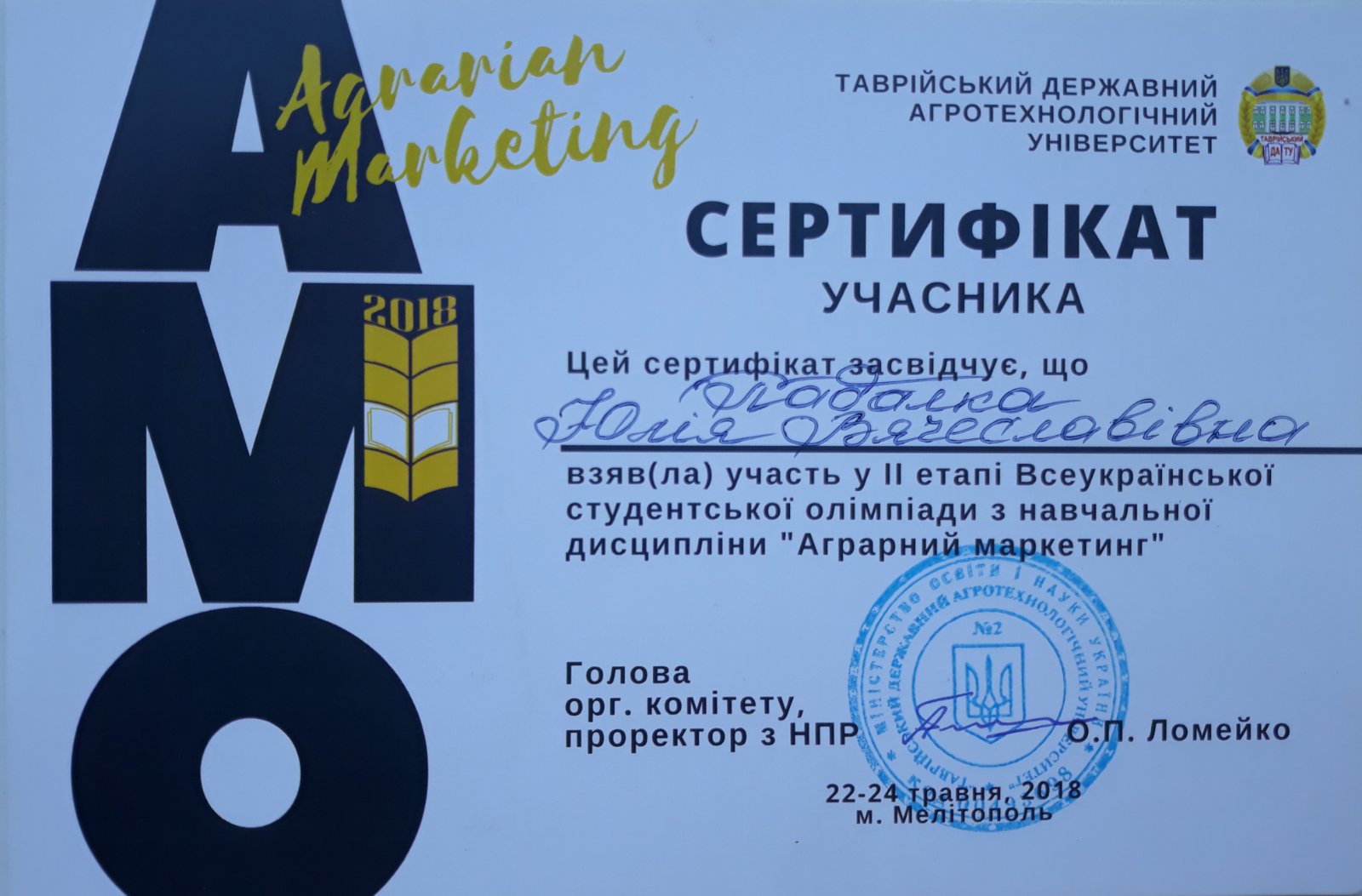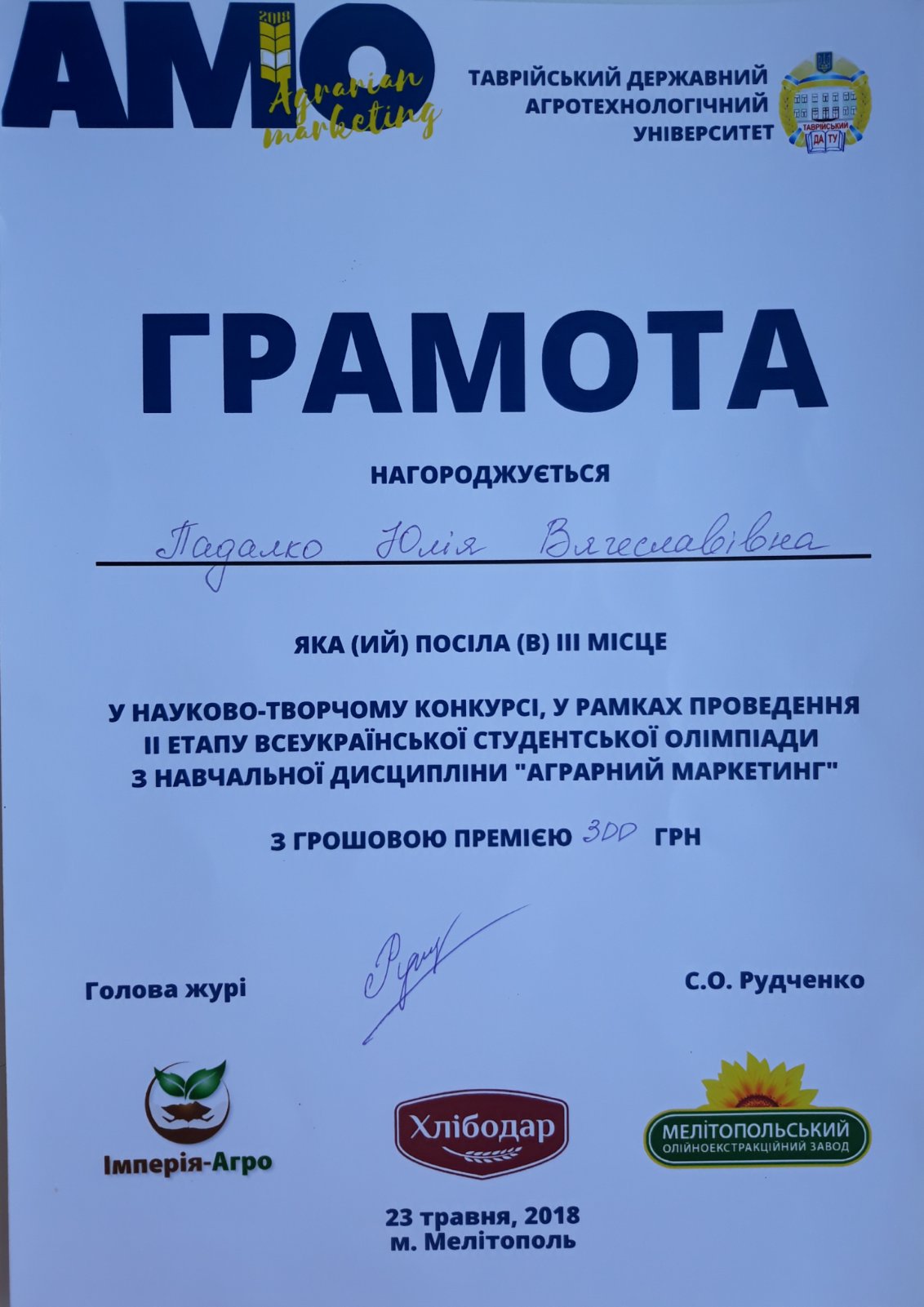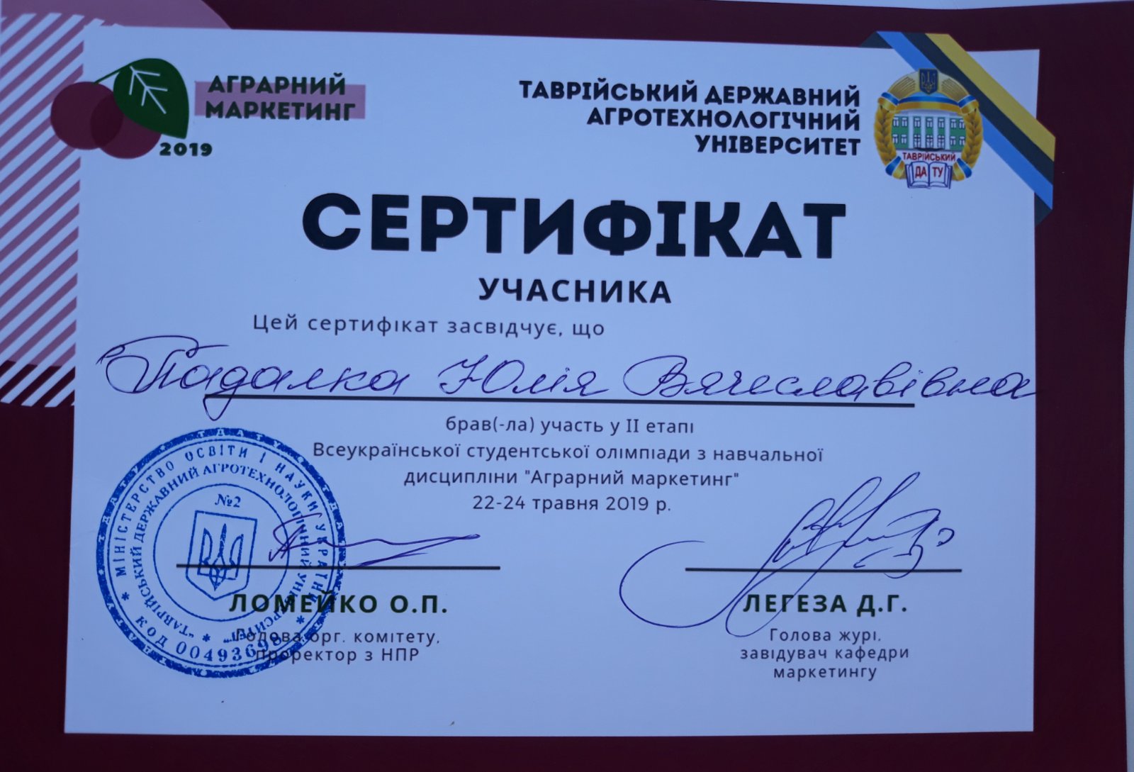 ІІ етап Всеукраїнської студентської олімпіади з навчальної дисципліни «Аграрний маркетинг» (22-24 травня 2018-2019 рр.). Таврійський державний агротехнологічний університет, Мелітополь.
